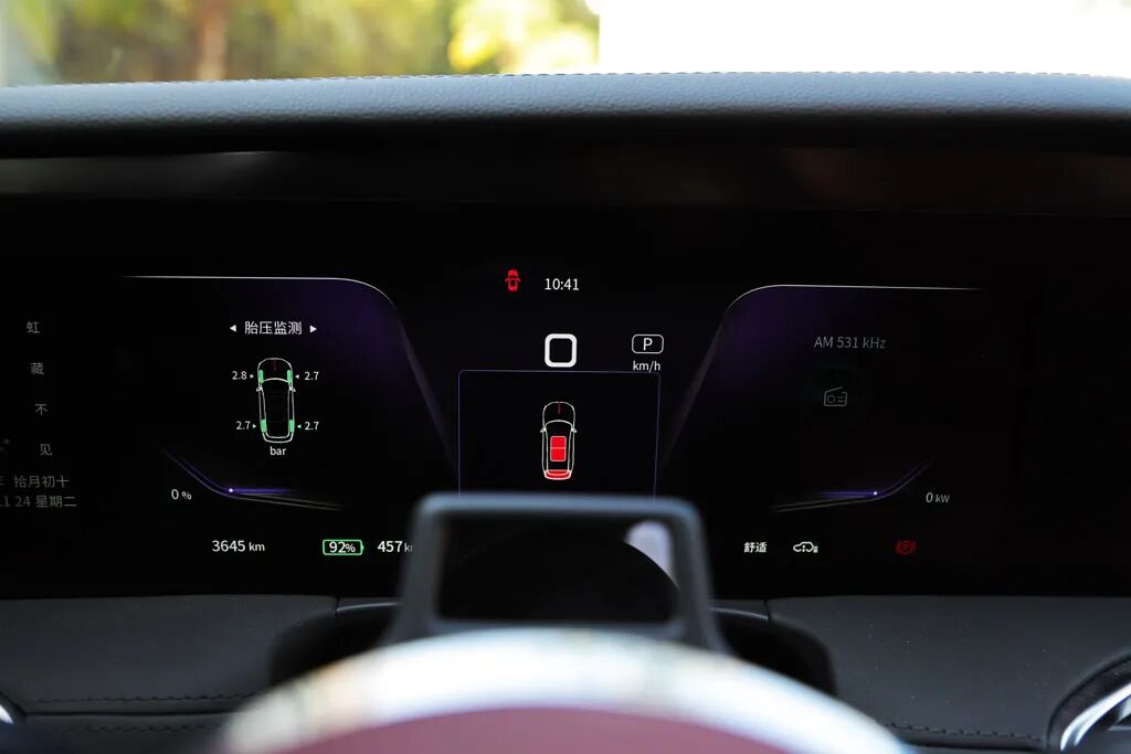 液晶仪表:左侧为胎压、能耗等行车信息,右侧为多媒体信息,中间为车速、驾驶辅助等信息;