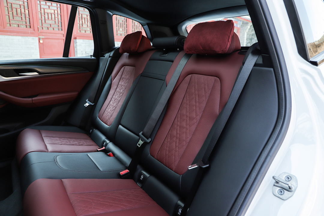 火山红/黑色的拼色材质座椅是顶配车型的专属,座椅面料带有类似菱形图案的缝线,提升了质感。功能方面,前排座椅支持电动调节以及腿托调节,主驾驶座还带有腰部支撑调节(4向)以及两组座椅记忆功能。舒适性配置方面,前排座椅加热为全系标配。