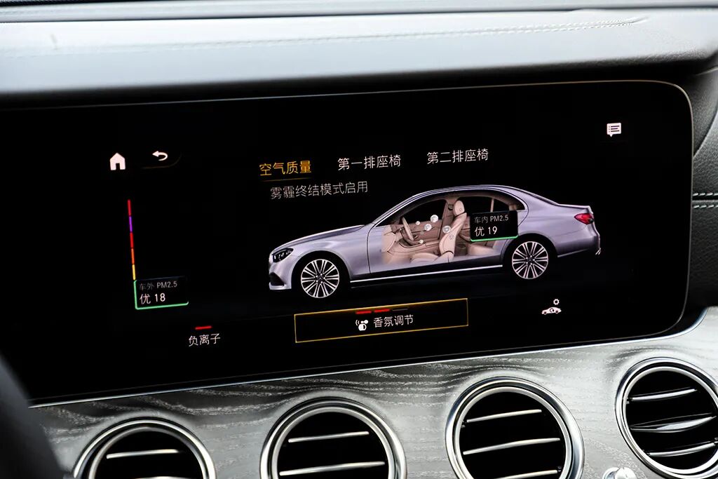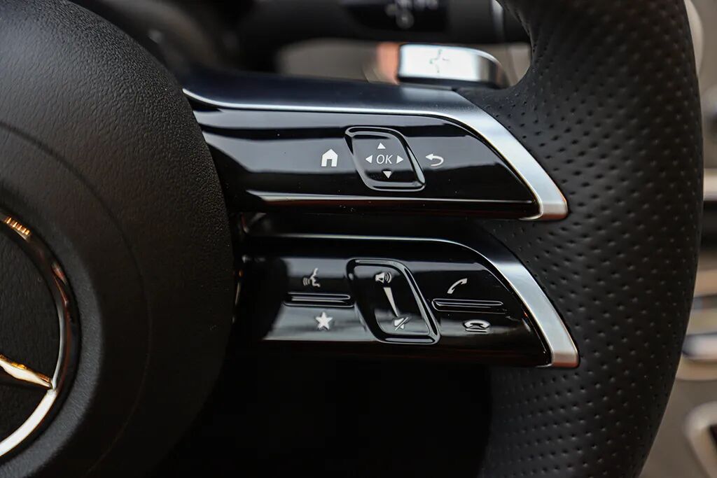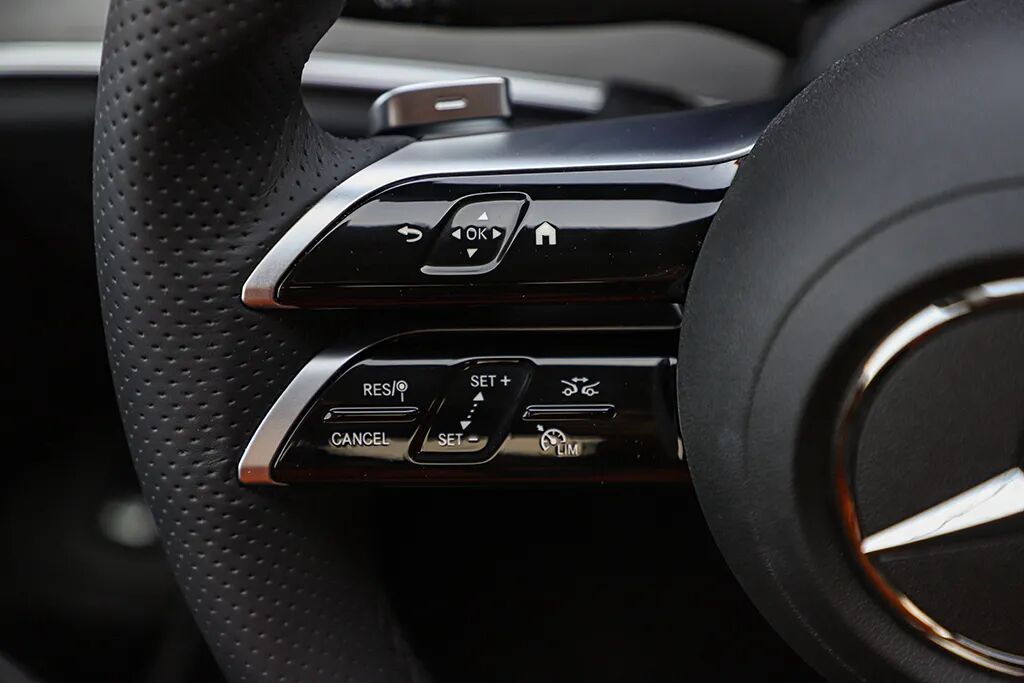 这款试驾车为2021款E 350 L 4MATIC 运动型,所以使用了运动款方向盘,新的方向盘配备电容式传感器,因此在驾驶员在开启自适应巡航模式时,不必刻意给出小幅转向信号,方向盘也可以感知到双手。