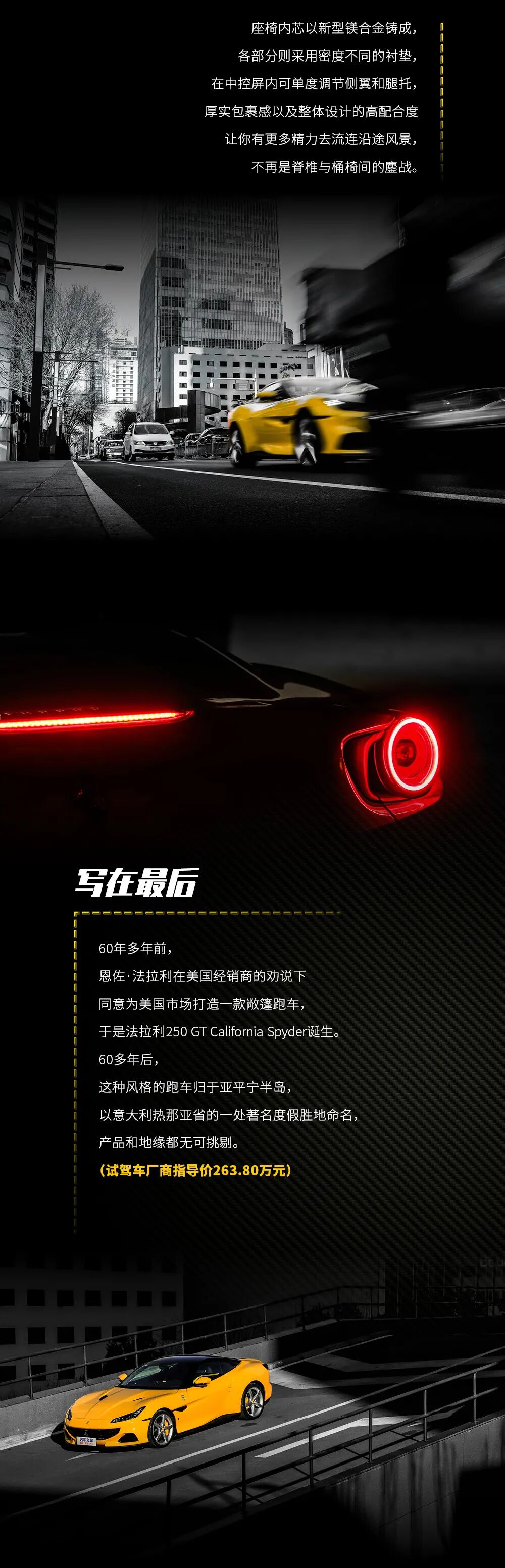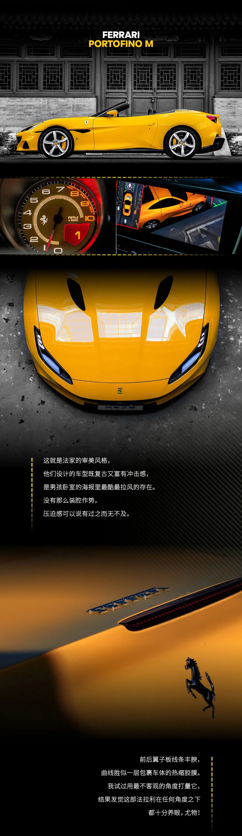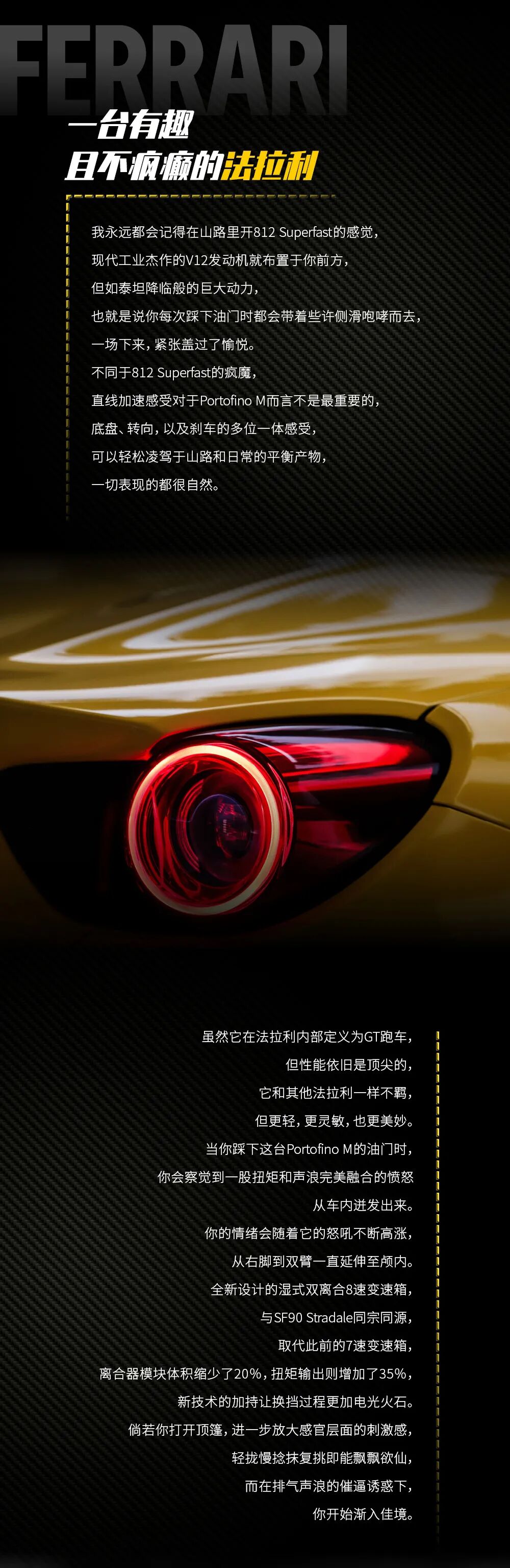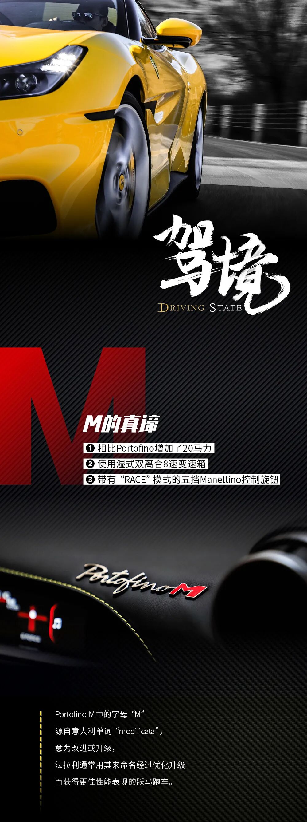法拉利Portofino M象征着法拉利品牌即将开启全新探索之旅。Portofino M中的字母“M”源自意大利单词“modificata”,意为改进或升级,法拉利通常用其来命名经过优化升级而获得更佳性能表现的跃马跑车。