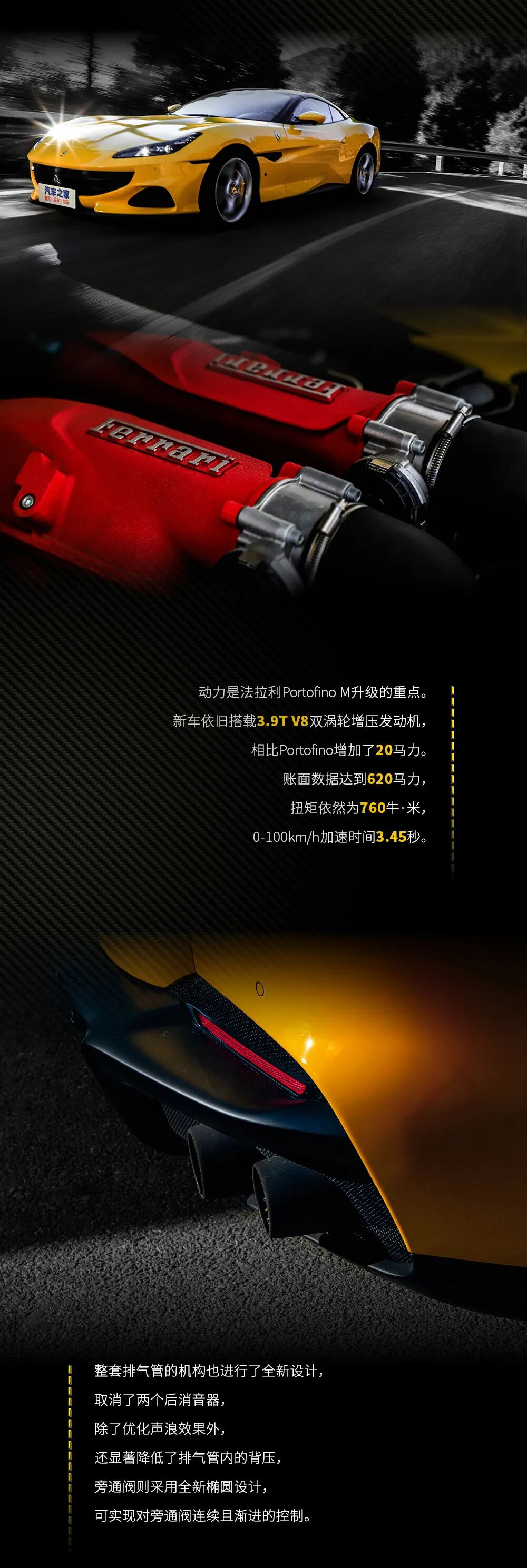 在动力系统方面,法拉利Portofino M搭载的3.9T双涡轮增压V8发动机已连续四年斩获“国际年度引擎大奖”。全新发动机经过升级可在7500转/rpm的时候达到620马力的最大功率,比法拉利Portofino的发动机高出20马力,最高时速超过320公里/小时,0-100km/h加速时间仅需3.45秒。除此之外,法拉利Portofino M使用全新设计的湿式双离合8速变速箱,取代此前的7速变速箱,全新变速箱的离合器模块体积缩少了20%,扭矩输出则增加了35%,为新车带来了更好的重量配比。