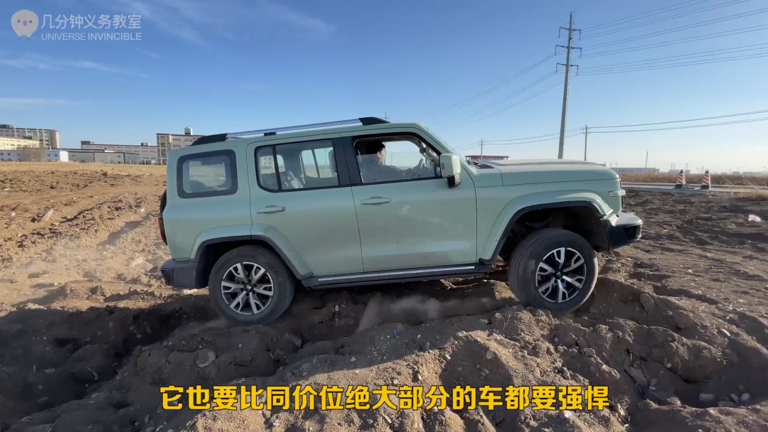 首先它的底盘大梁能承受更大的扭力,离地高度,接近角离去角,电子限滑这些都要有着巨大的优势,而且还有低速四驱。我们开了泥地模式,用四条公路胎,在这片烂路感受了一下,我觉得,满足大部分人简单玩玩的需求足够了。