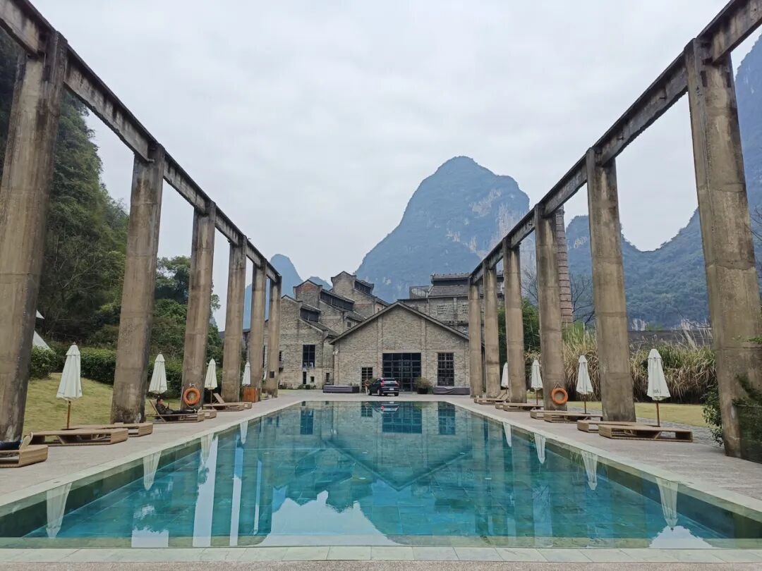 还有一个吸引我来到桂林阳朔的地方就是我们住的酒店,叫阳朔糖舍。这是一个由60年代国营制糖厂改造设计的酒店。车间宿舍食堂都被比较完整的保留下来。最著名的就是这个无边泳池,是原先糖厂用来装卸的码头,从酒店延伸进入漓江的山水之间,你们肯定在很多社交平台上见过。房间内的环境比我想象中要好,我们一起来看一下。