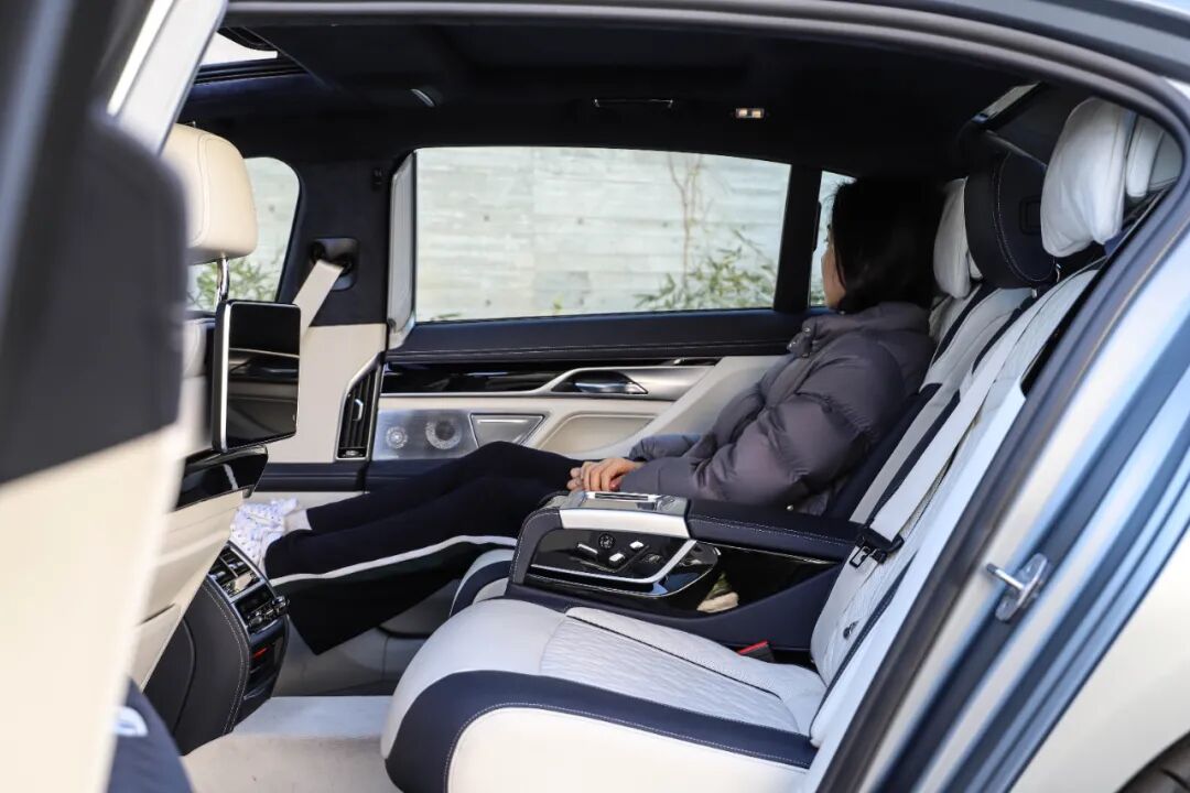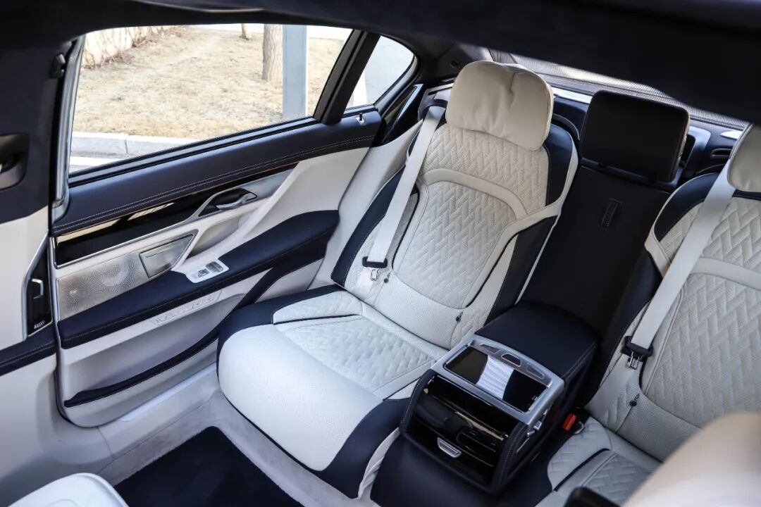 同样为个性化定制的细线纹全Merino真皮座椅前排主驾驶支持记忆,四座支持通风、加热以及按摩功能(副驾除外)。后排才是这台车的精髓,老板位提供半躺和正常乘坐两种模式,脚托更能让贵宾身心达到放松的状态。
