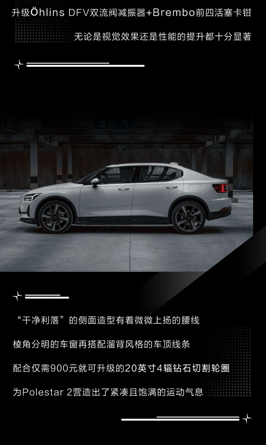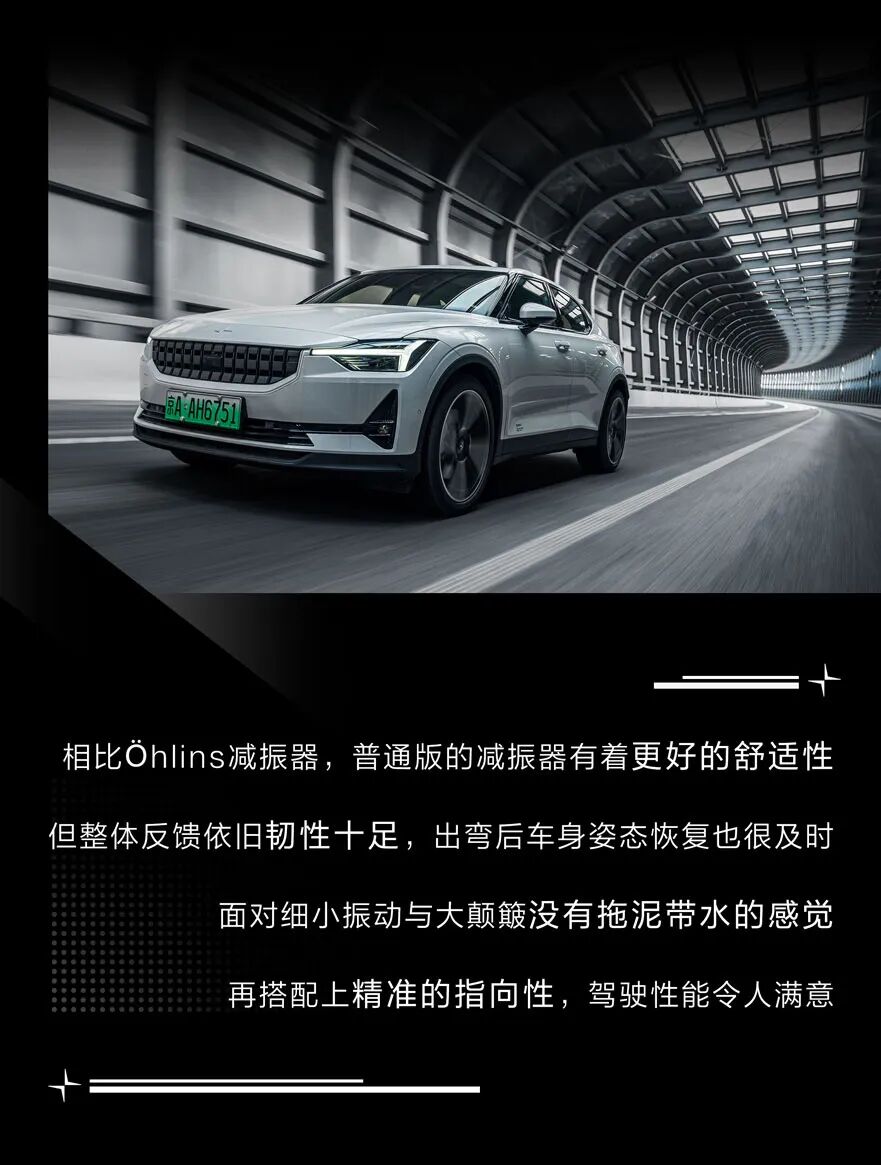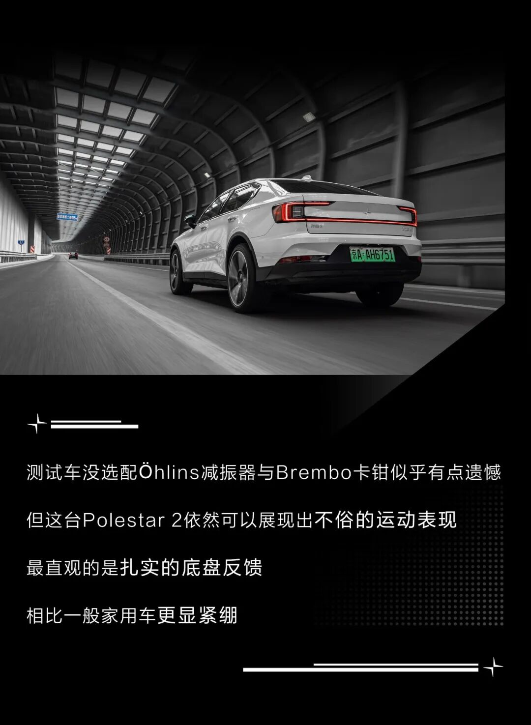 当然,Polestar 2最令人印象深刻的当属出色的驾控体验,即使没有选配Öhlins DFV双流阀减振器+Brembo前四活塞卡钳,这台车依然展现出了深厚的底盘调校功底,韧性十足的风格非常彰显档次感。