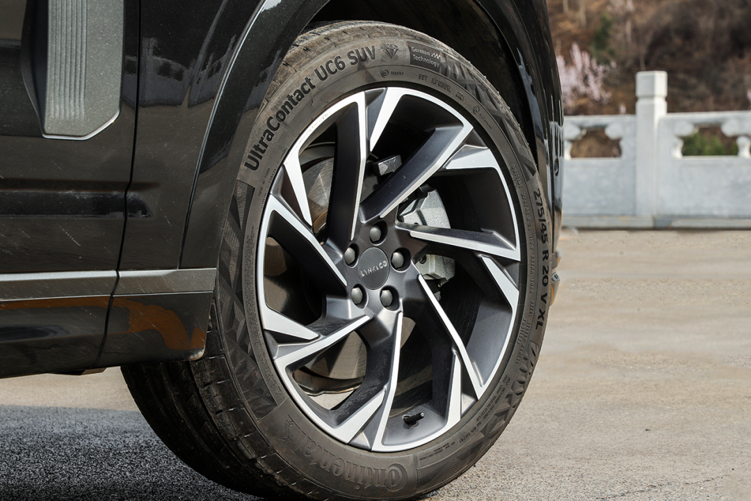轮圈尺寸达到20英寸,以领克09的身材来说,尺寸大小我认为刚刚好。轮胎方面,与之匹配的是马牌UltraContact UC6系列轮胎,规格为275/45 R20。