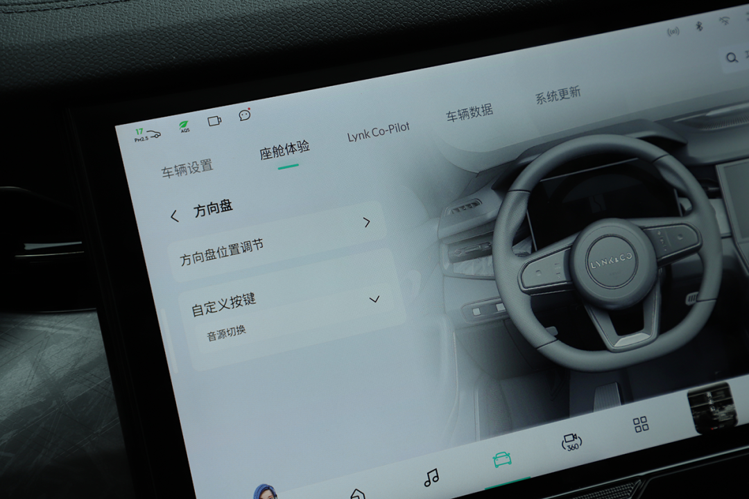 全新样式的方向盘很漂亮,盘辐使用Nappa真皮材质包裹,握感出色。方向盘电动调节功能为整车的高级感加分不少,只是在调节方式上略微繁琐。首先需要在中控屏里找到方向盘位置调节的选项,然后再通过方向盘上的按键进行前/后、上/下的调节,操作方式类似于“特斯拉”。