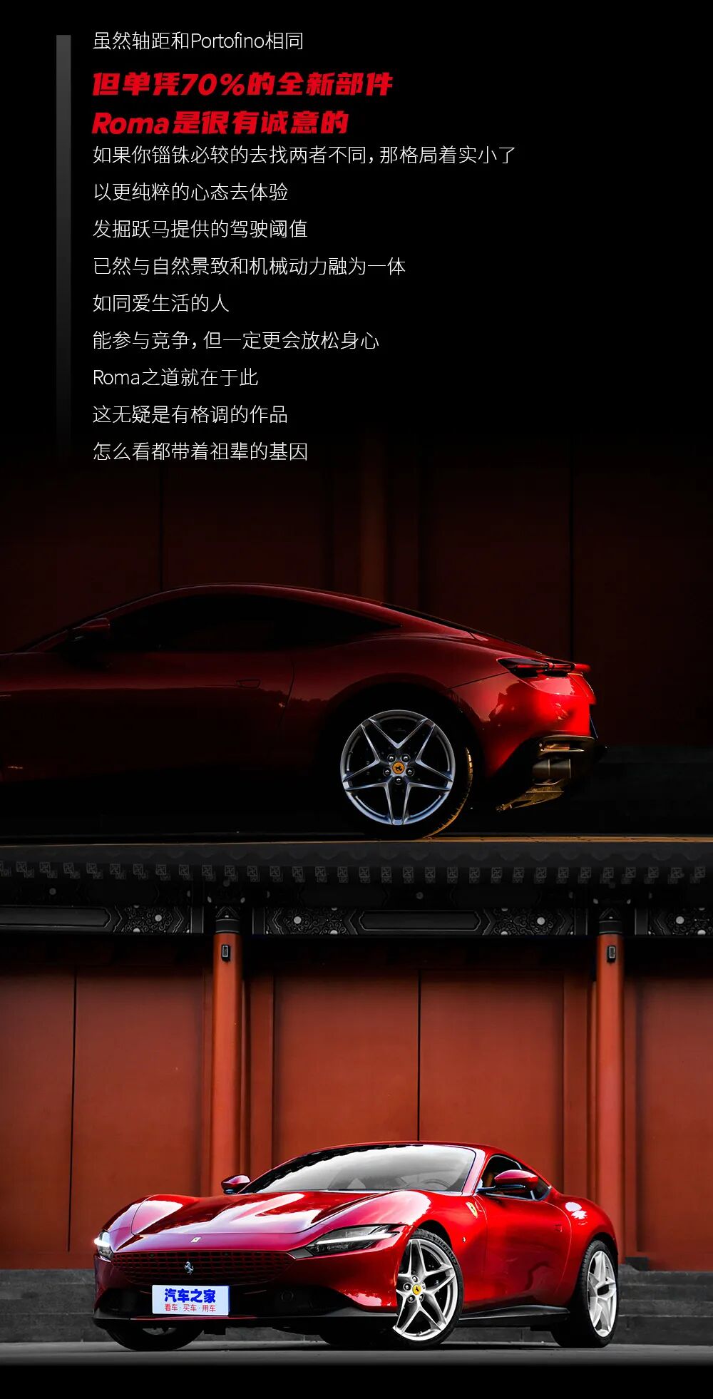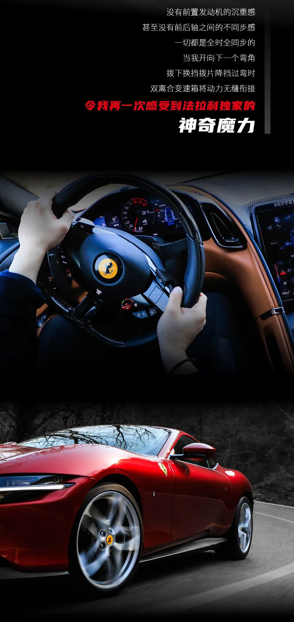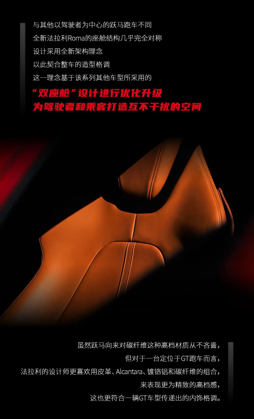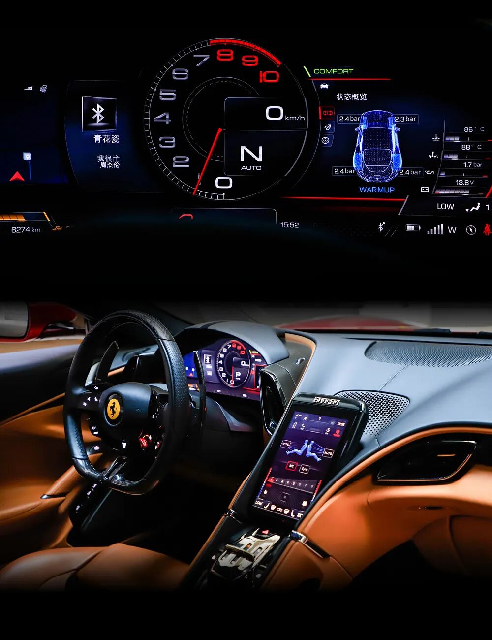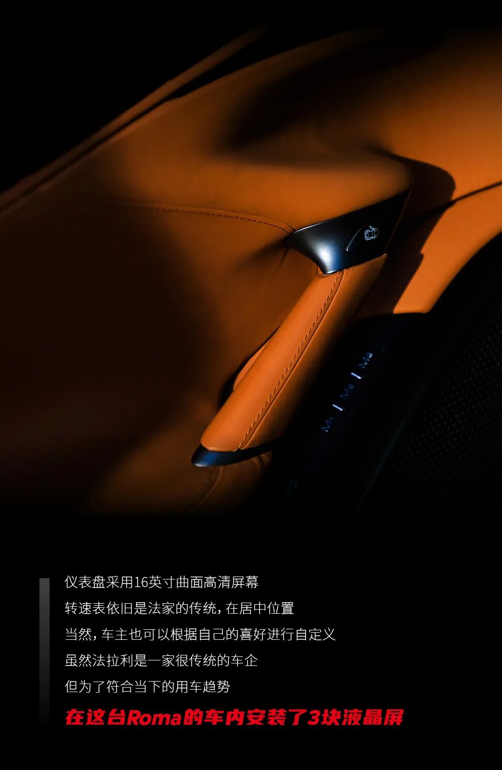 Roma采用了官方称之为“双座舱”的设计理念,并使用了全新的HMI人车交互界面。全车内饰都使用了质感细腻的真皮材质,完美地演绎了低调与奢华。此外,新车使用了16英寸的全液晶仪表盘,搭配中控8.4英寸的多媒体触控屏,以及采用了与SF90相同的集成触控功能的三辐式多功能方向盘;而副驾驶前方则另有一块小型的乘客显示屏,能够同步部分行车信息。