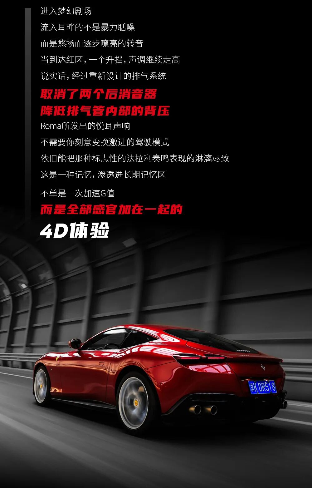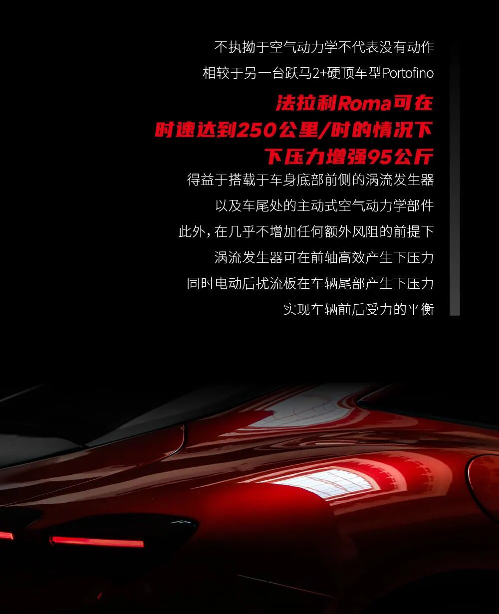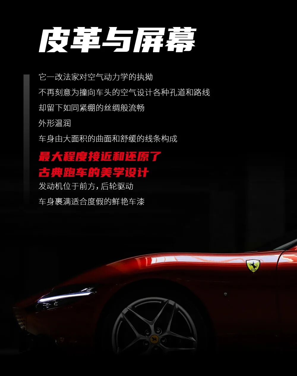 法拉利Roma使用独特的鲨鱼鼻车头造型,前进气格栅则采用网眼式的中网设计,搭配两侧横向布局的LED日行灯,感官上非常复古。新车修长的前机舱盖,以及整体靠后的座舱位置,显示出该车前中置发动机与后轮驱动的布局。新车摒弃了大量空气动力化造型套件,让新车车头部分保持简约而优雅的设计理念。