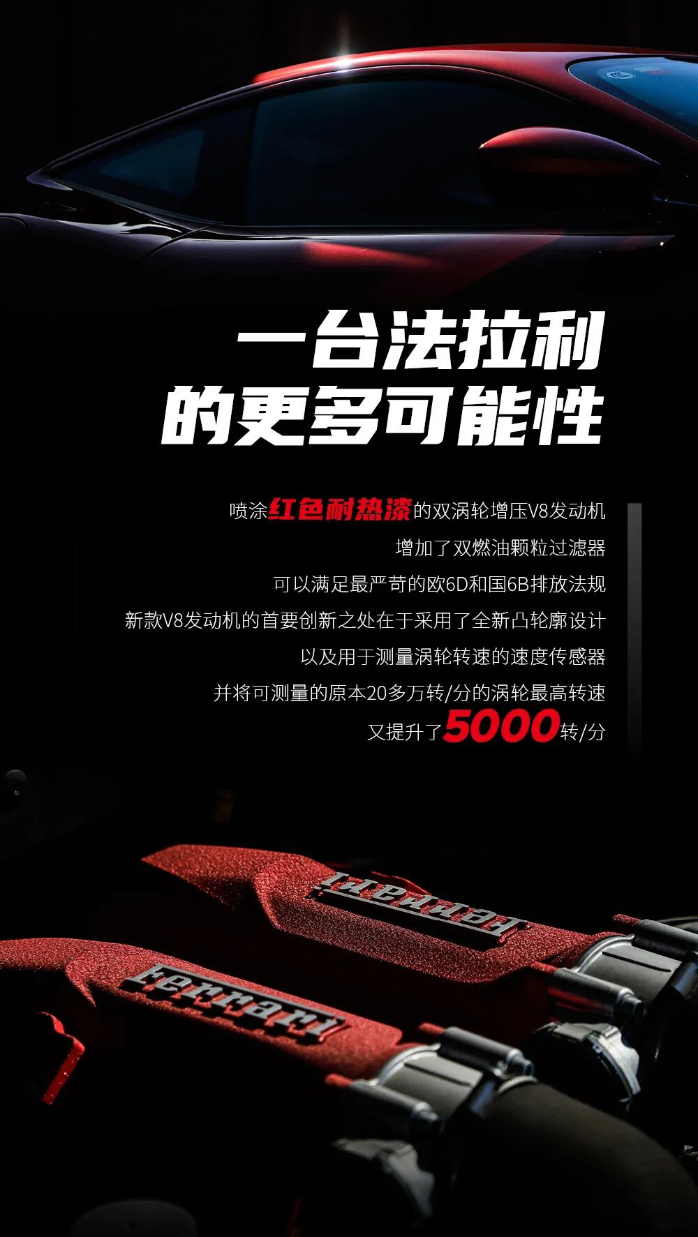 法拉利还首次在4座GT车型上搭载了Side Slip Angle Control(SSC 6.0)侧滑角控制系统,以及法拉利Dynamic Enhancer(FDE)动态强化系统。动力方面,新车将搭载3.9T涡轮增压V8发动机,最大功率620马力,最大扭矩760牛·米;传动系统匹配8速双离合变速箱,官方0-100km/h加速时间仅需3.4秒,0-200km/h加速时间仅需9.3秒,最高时速可达320km/h。