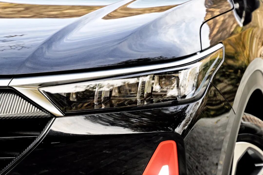 东风风神AX7 PRO采用新样式的品牌Logo,实拍车型采用黑色车漆+橙色饰条搭配,为整车增添了一丝灵动。全系标配的矩阵式LED大灯造型不错,实拍的顶配版还支持自适应远近光、自动头灯、大灯延时关闭等功能。