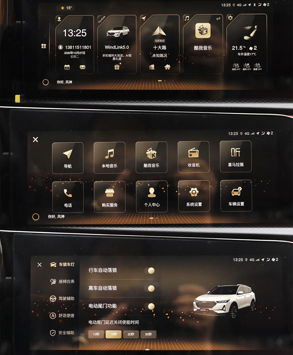 10.25英寸中控大屏也有了很大升级,换装全新的Windlink 5.0车机系统后,界面样式有了改变,功能也大大丰富。语音识别功能基于百度自然语义,识别率很高,且无需传统关键词触发,可以像和助手对话一样进行指令输入,此外,车机还支持OTA远程升级。不过这套车机在使用时会偶发卡顿,不太流畅,这方面还有待提升。