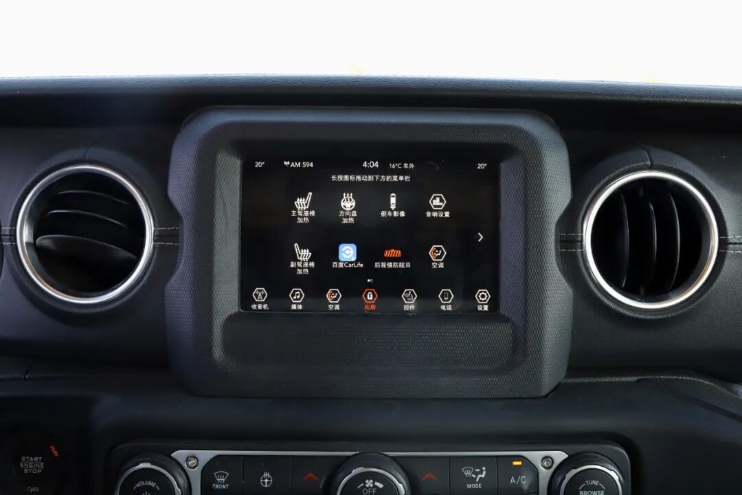 相比上代车型,新一代牧马人内饰褪去了粗犷,造型宽大的中控台被皮革包裹而且还加入了缝线,中间还设有7英寸中控屏,品质感提升明显。车窗控制按键照旧设置在中控台中央,手套箱上方的扶手也没有缺席。