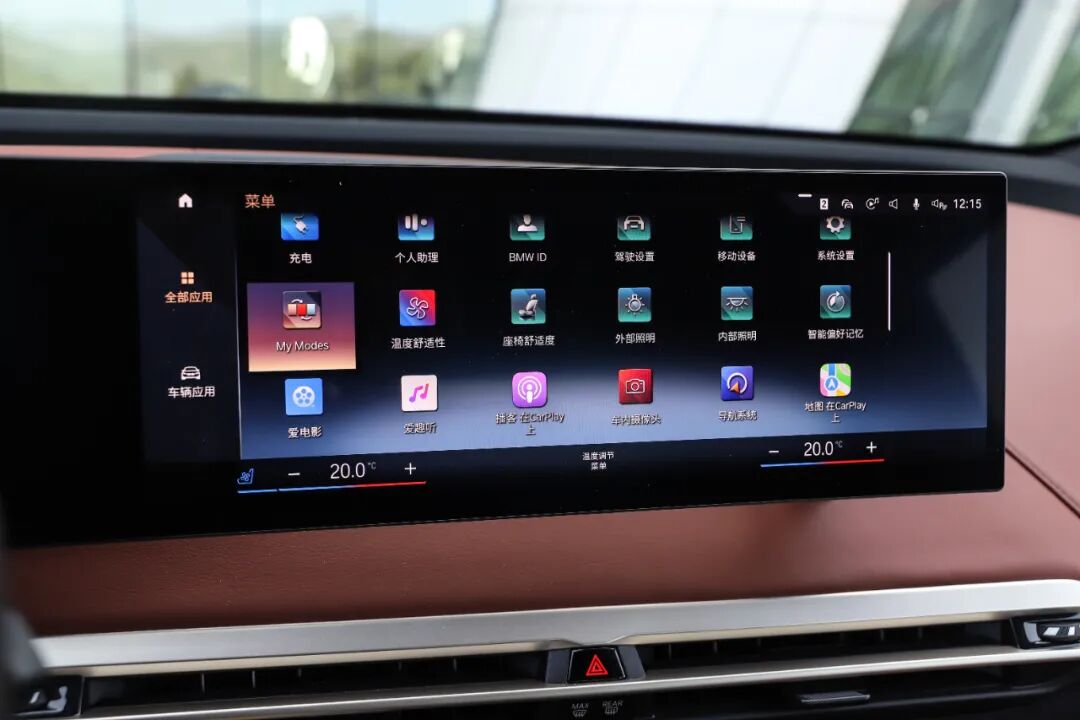 连体式曲面屏“飘浮”在低矮的中控台之上,并向驾驶员一侧倾斜,设计灵感来源自客厅的大尺寸液晶电视,仪表盘为12.3英寸,多媒体屏幕为14.9英寸。重中之重就是宝马iX搭载了iDrive 8系统,操作逻辑十分简洁,没有多级菜单进行繁琐的操作,常用的功能都可以在菜单向下直接拉取调用,使用起来十分流畅,UI设计相比iDrive 7系统有着明显的提升。