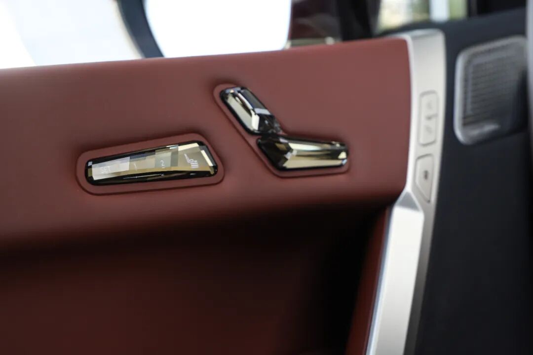 一体式座椅足够宽大,调节和座椅记忆按钮采用水晶材质,并放置在了门板处,相当精致。实际乘坐层面,座椅填充物厚实,十分柔软,只不过前后排的坐垫略短,对于大腿的承托还有一定的提升空间。