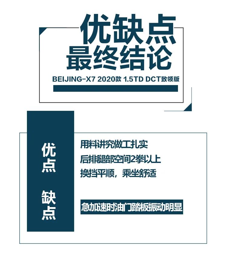 短暂的一天时间里,BEIJING-X7给我留下了很深的印象,它外观上完全没了山寨的影子,内饰汲取奔驰的设计精华营造出了不俗的车内氛围,后排腿部空间达到2拳以上且乘坐舒适,动力够用注重平顺性,后备厢规整。除了急加速时油门踏板上会传来明显振动影响整车行驶质感外,一番体验下来还真没发现它身上的其它短板,不禁感叹中国品牌10-15万元SUV车型市场又添了一员猛将。还有就是感觉它顶配车型的价格有些偏高,接近15万了,市场终端能有一些优惠的话应该能刺激到不少持币代购的消费者。