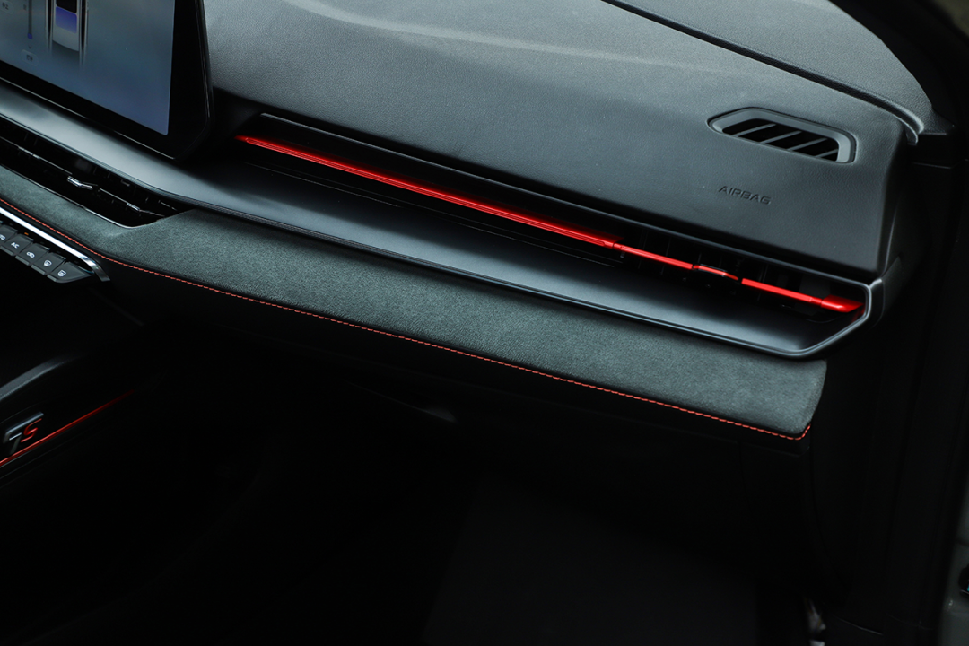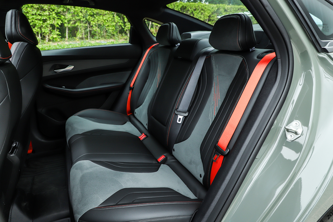 座椅面料使用类麂皮的材质包裹,触感不错,内部的填充物很柔软,乘坐舒适性不错。橙色的安全带作为点睛之笔,很好地烘托了运动氛围。后排的乘坐空间不算突出但也没有短板,该有的基础配置(后排出风口、后排中央扶手等)都有,能够达到家用车的标准。