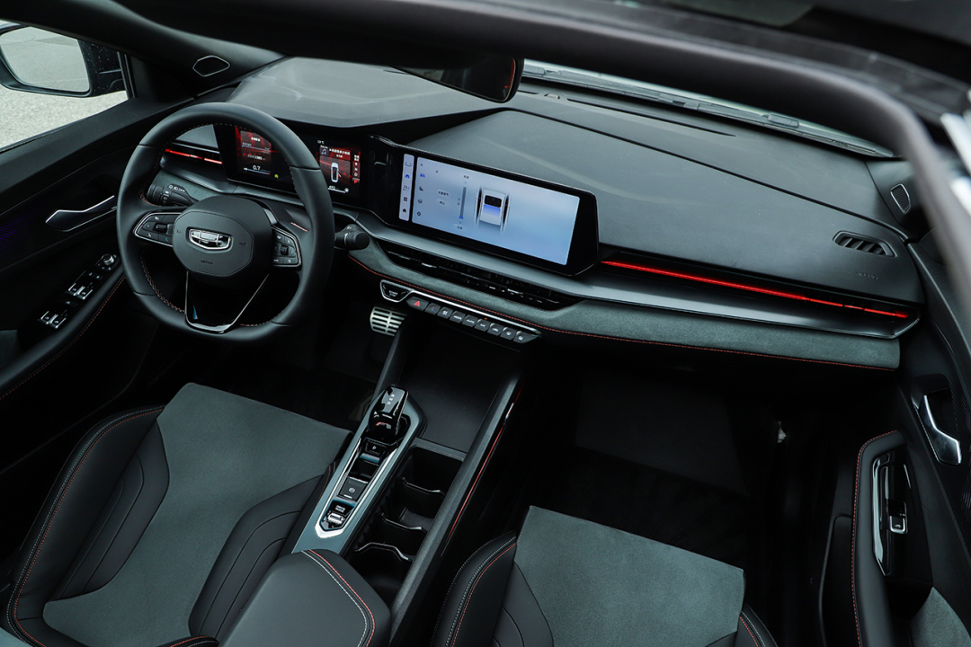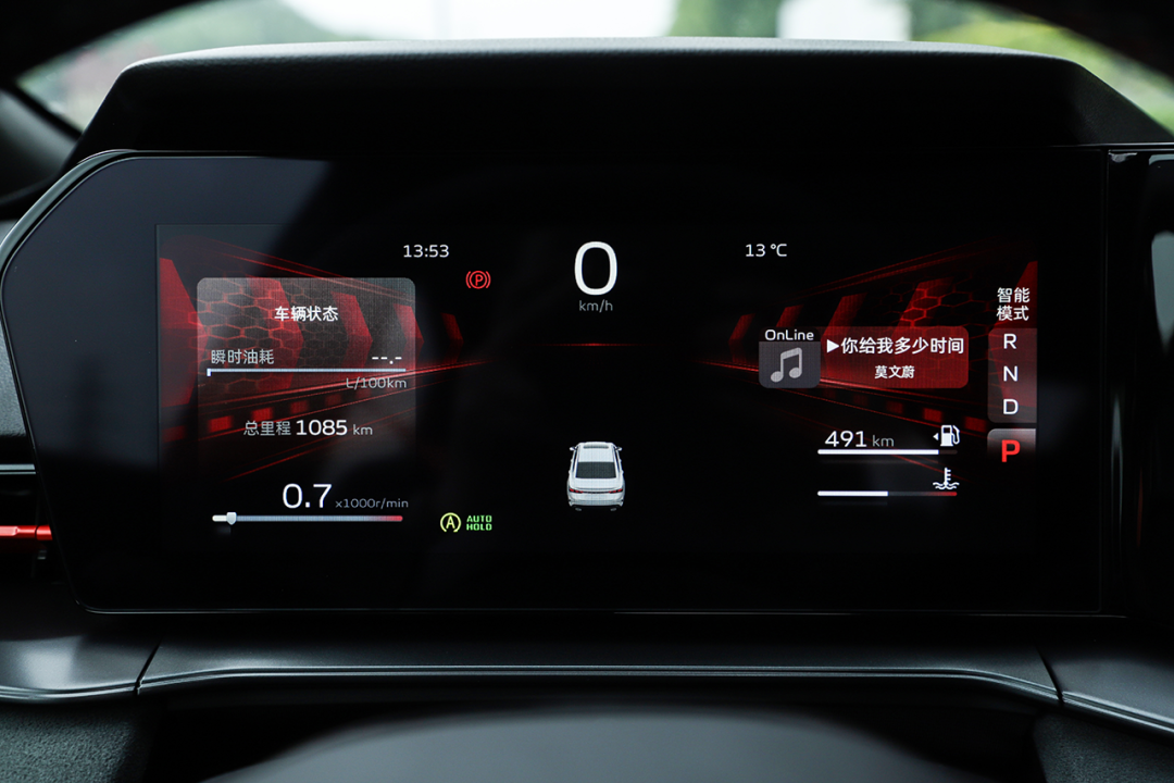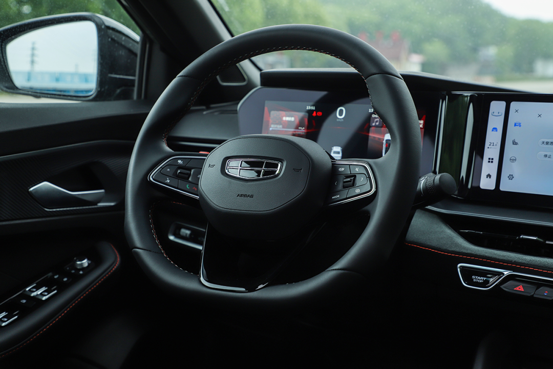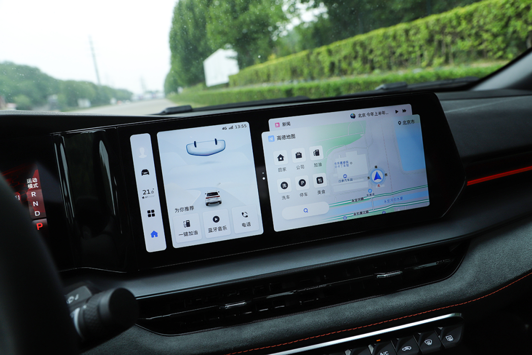 10.25英寸全液晶仪表盘和12.3英寸中控屏形成双联屏设计,UI显示界面清新简洁,屏幕清晰度让人挑不出毛病。中控屏搭载银河OS系统,常见的导航、语音识别、车联网等功能均有配备,日常用车有保障。