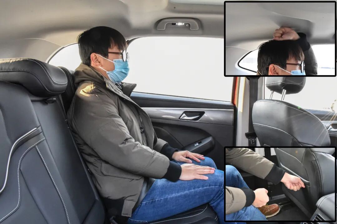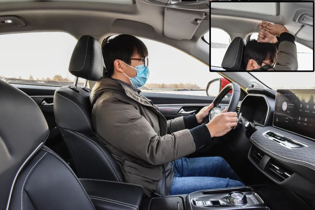 身高175cm的体验者进入前排,将座椅调至最低位置,头部空间为一拳三指左右,还算充裕,没有压抑的感觉。