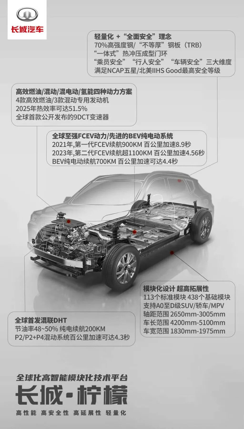 据官方介绍,哈弗柠檬平台可兼容混动、燃油、混动以及氢能四种动力组合,其中包括4款燃油发动机以及3款混动专用发动机,拥有较高的兼容性,支持A0-D级的SUV/轿车/MPV。也就是说,一款平台可以制造多款新车。产品轴距范围为2650-3005mm、车长范围在4200-5100mm,车宽范围为1830-1975mm。初恋正是该平台下的第三款车型。