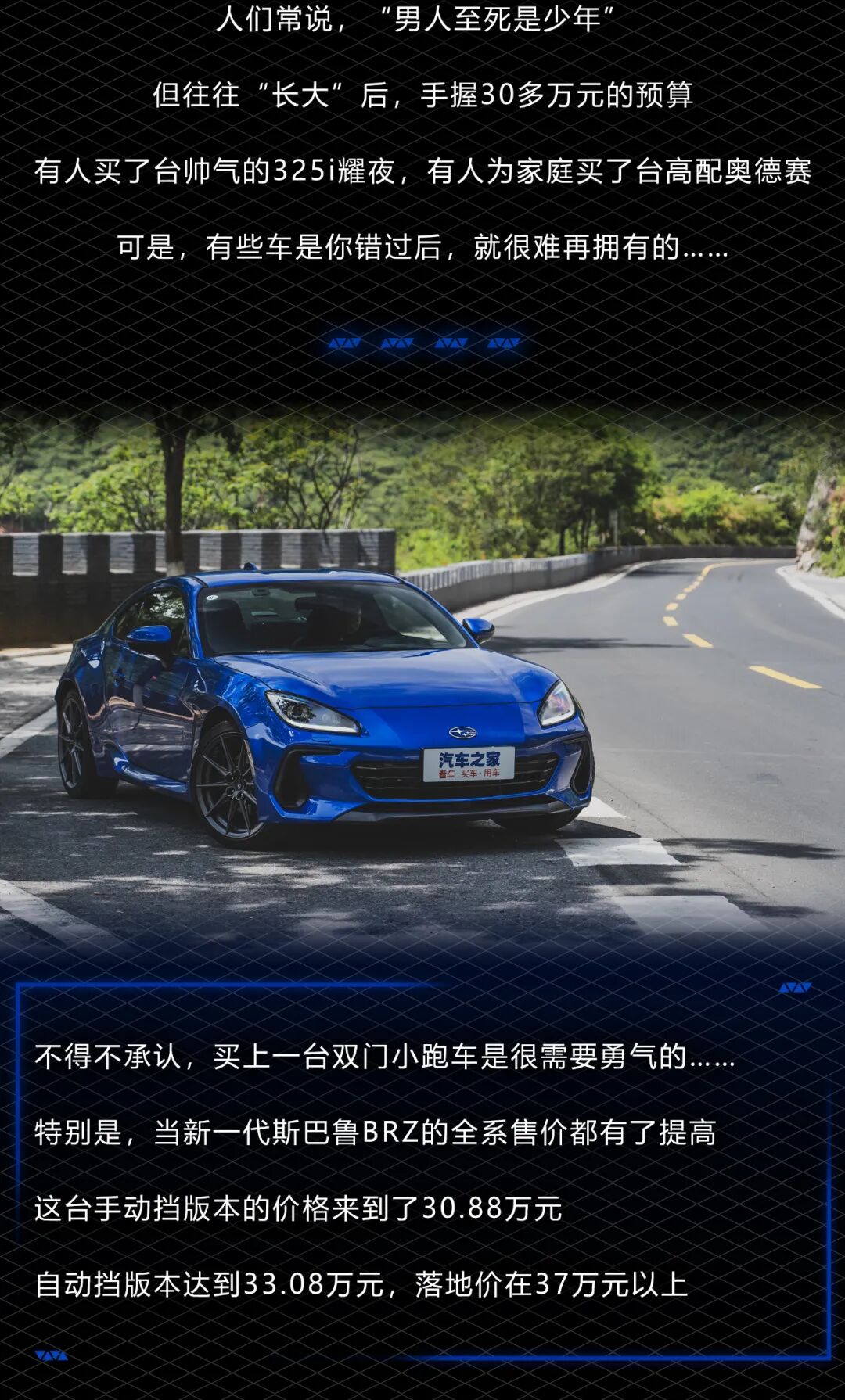 它的加速或许不够快,也没有宽大的轮胎,但它一定可以给你最有乐趣、最纯粹的驾驶感受。正如开头所说的,手握三十多万的预算选择一款小跑车是需要勇气的,但是当你的肩上挑起了家庭的重担,当你的内心也不再年轻……错过的,或许就再也回不来了。