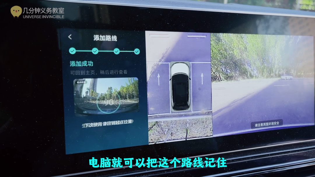这辆车在停车这块做的非常友好,比如隔壁车停的不讲究,可以遥控它。然后有一个设置泊车路线的功能,比如我现在把起点设在这,我开始停车,停完后,设置终点,电脑就可以把这个路线记住,以后直接可以使用自动泊车功能,入库,出库都可以设置,这个功能的意义在于一个家庭里其中一个人手法比较臭,另一个人可以提前把线路做好,臭的人直接用就行了。
