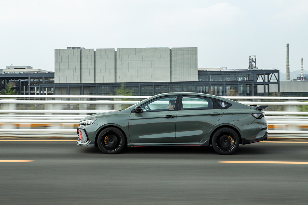 车侧造型与传统的三厢家用轿车存在明显差异,车身腰线从前翼子板处一直贯穿至车尾,官方称之为“疾驰高腰线设计”。溜背车顶线条让车身姿态视觉上更显低趴,下方的侧裙带有橙色线条点缀,提升了运动气息。
