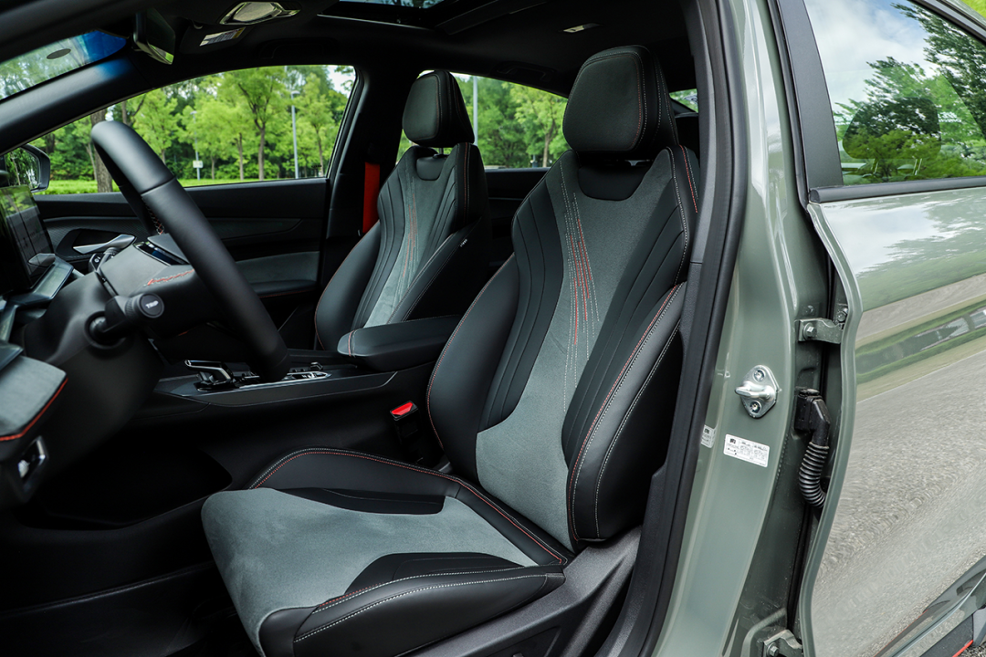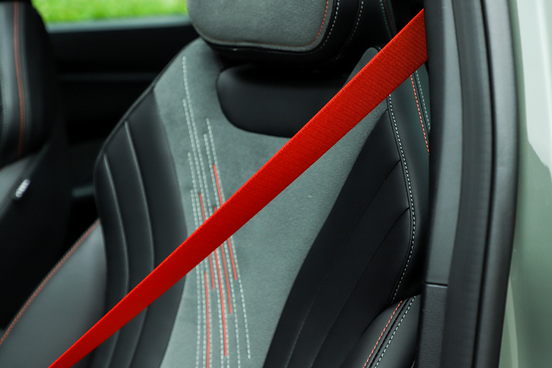 一体式运动风格座椅采用皮质/类麂皮混搭的材质包裹,内部填充物软硬适中,兼顾了乘坐舒适性以及对身体的包裹性。橙色的安全带格外显眼,很能讨好眼球。