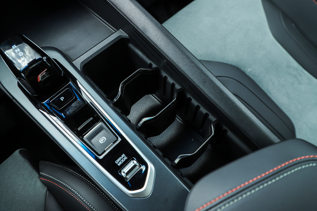 电子挡杆在同级别车型中并不多见,挡杆造型类似飞机操纵杆,官方称之为“竞速电子挡杆”。水杯架配备3个可调节的挡板插片(十片插槽),可实现多种不同的空间组合,储物空间表现更加灵活。