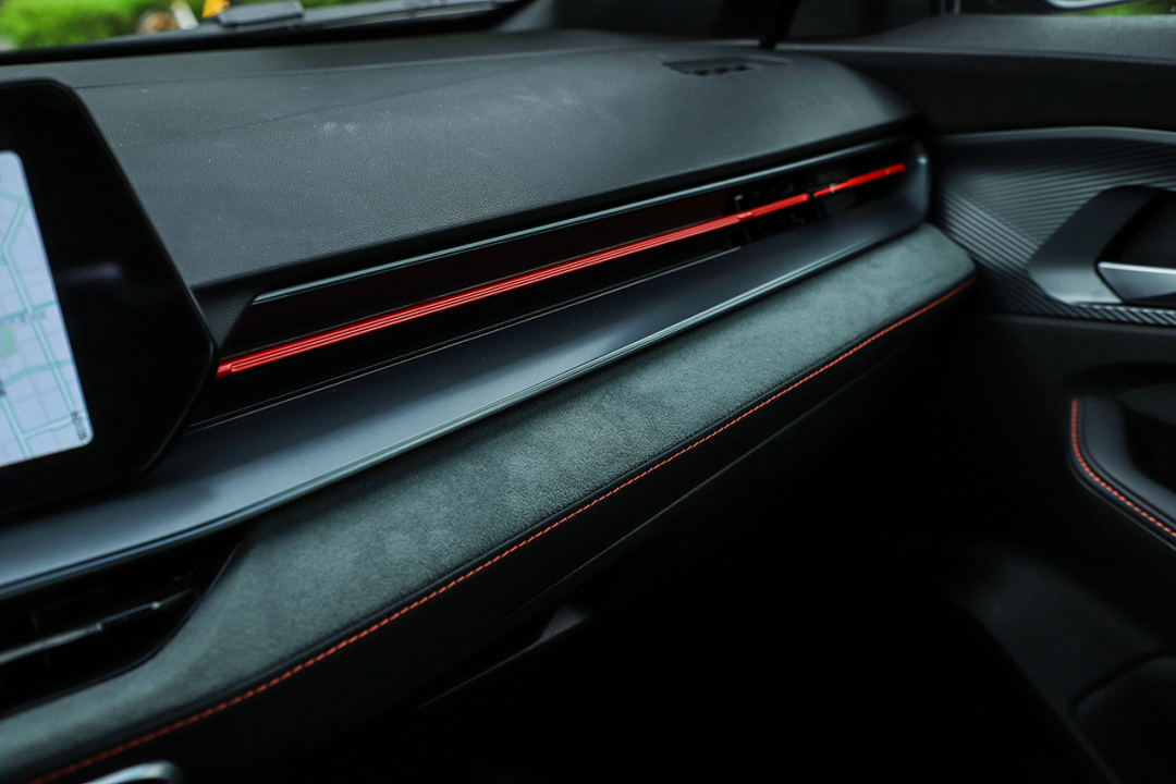 内饰座舱的风格相对简约,但又不缺乏科技感与精致感。中控台线条平直,起到了延伸横向视觉效果的作用,让车厢座舱视觉上更显开阔。中控台使用大量软性材质以及类麂皮面料覆盖,并辅以橙色饰条点缀,运动氛围足够浓郁。平底方向盘采用皮质包裹,盘辐粗壮,握感饱满。