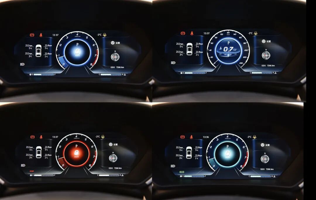 10英寸的液晶仪表为顶配车型独享,UI主题可根据当前驾驶模式(普通、运动、ECO)进行变化,其中普通模式还可以自定义显示页面样式,带有流星划过的动态效果十分抓人眼球。