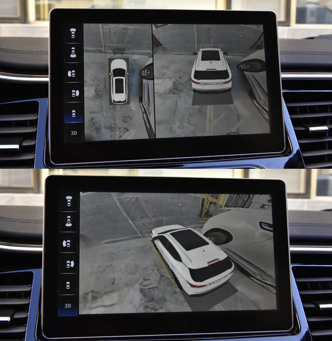 360度全景影像是一大亮点,对于车身周围物体的探测很到位,左右滑动屏幕即可查看360度影像,不过畸变会比较明显,比如和右侧的这台SUV停在一起时,试驾车型就好像一台“玩具车”。