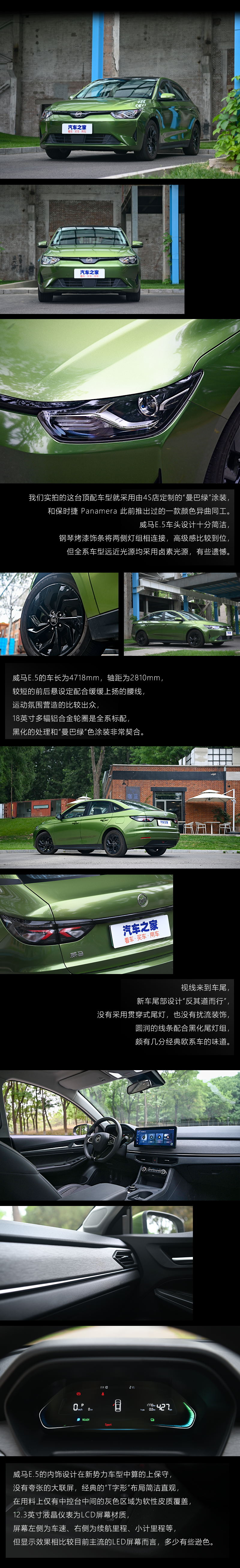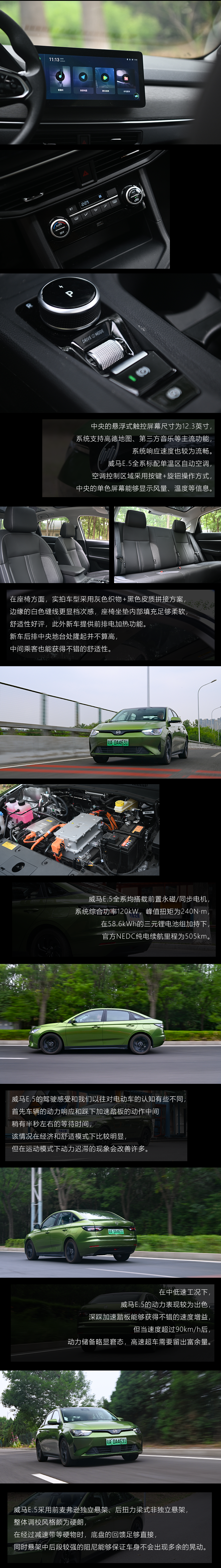 在15万左右的价格区间内,威马E.5的表现能够算中等偏上水平,车辆的舒适性配置比较完善,2810mm的轴距配备填充柔软的座椅,乘坐舒适性较为上乘,此外它也是这个价位中为数不多能够DIY涂装的个性产品。但新车依旧存在例如内饰质感一般、动力迟滞等问题,若您的用车需求更加看中年轻化和乘坐舒适性,威马E.5还是比较称职的。