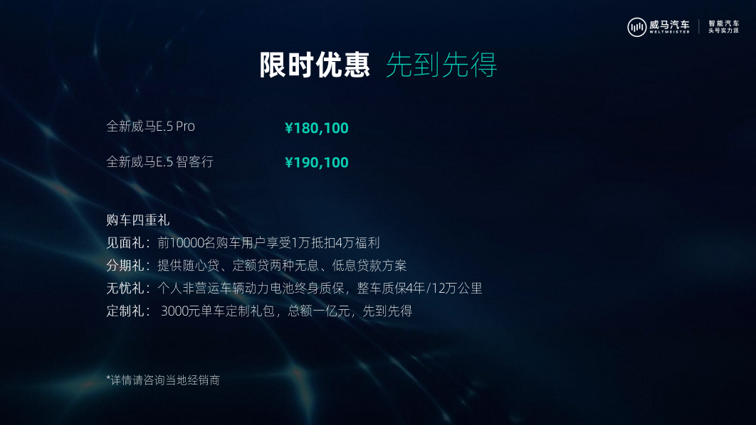 此外在售价方面,虽然2022款威马E.5官方售价区间为18.01-19.01万元,但是目前威马汽车为E.5推出了官方促销政策,前10000名购车用户享受“1万抵4万”优惠,相当于降价3万元,因此该车的实际售价为15.01-16.01万元。