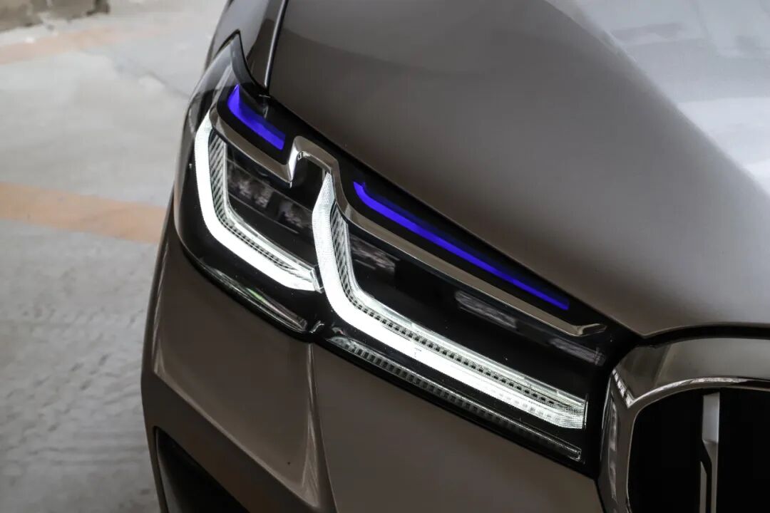 G底盘的末期版本5系将日间行车灯改为了双L形,并且整个大灯造型更加纤细。这台试驾车选装了智能激光大灯,费用为12000元,蓝色的装饰件看着够唬人,的确在铺路效果上有着很棒的表现,但由于开启条件比较苛刻,所以实际使用起来的用处不大。