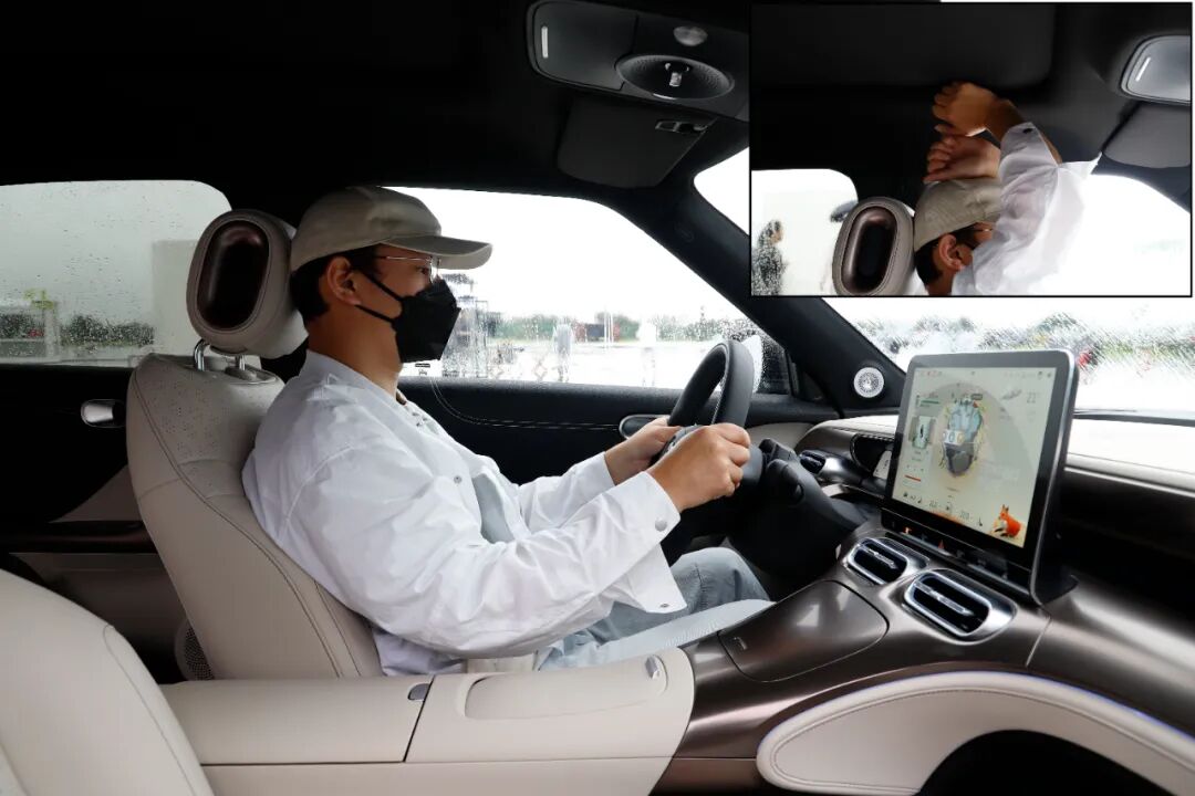 身高172cm的体验者进入前排,并将座椅位置调至最低,此时的头部空间为两拳左右,还算充裕。