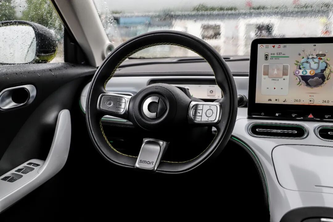 三辐式方向盘的盘辐偏大,盘身造型与吉利、沃尔沃部分车型相似,内部的黄色缝线增添精致氛围,两侧的多功能按键运用了银色饰板进行点缀,配合底部的smart标识,玩乐属性很强。