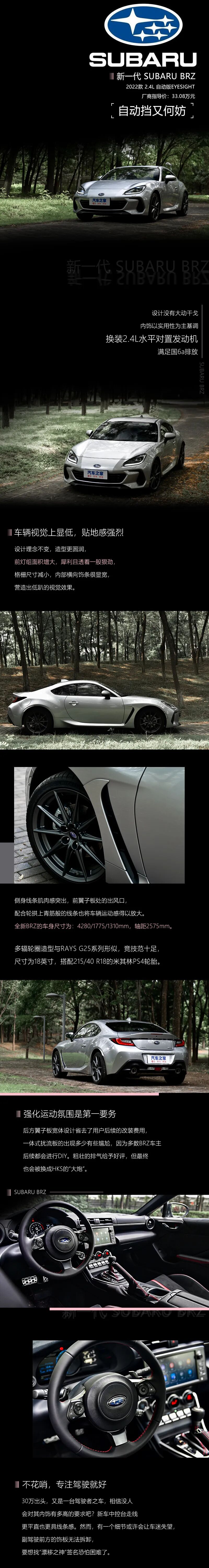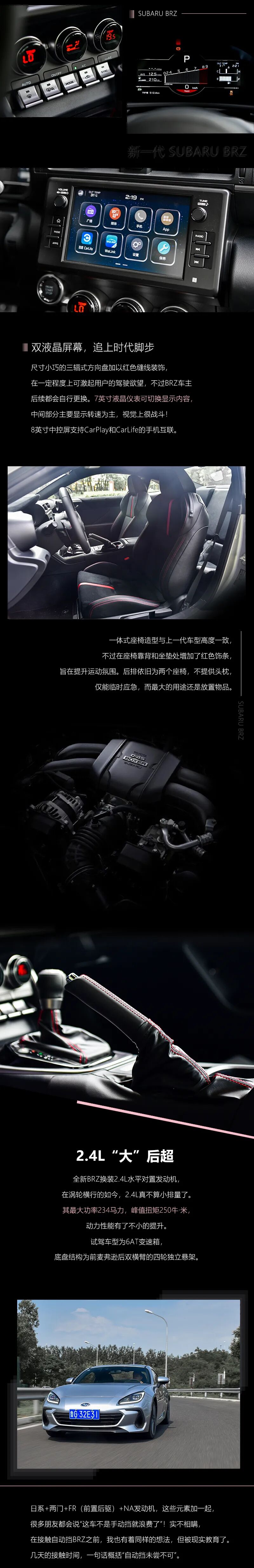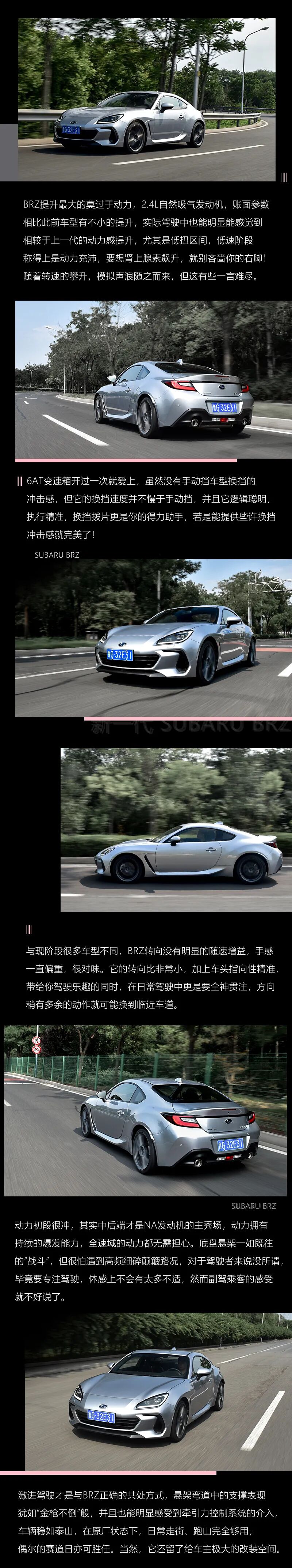 操控性是BRZ的最大优势,并且新款车型还将此前车型动力的短板补齐了,更为可贵的是,在涡轮车型大肆横行的如今,它依旧搭载自吸发动机,2.4L排量更是可以进阶“大排量”阵营。不过想体验这份快乐也不是件易事,因为该车的排放为国6a,使它无法在国6b标准的地区(如北京、上海)完成车辆登记手续,如此的话很多朋友将无缘这台驾趣横生的小车。