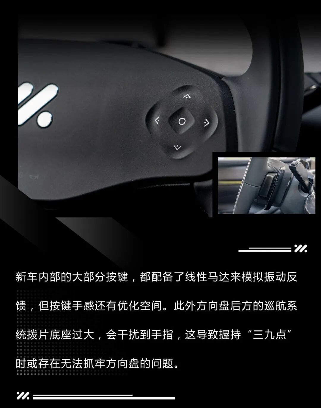 当然,作为新品牌的首款车型,智己L7也存在一些小问题,例如通过线性马达提供振动反馈的按键很酷,但手感却并不算理想;方向盘背后的辅助驾驶控制拨片非常方便,但较大的底座会干扰手指握持。