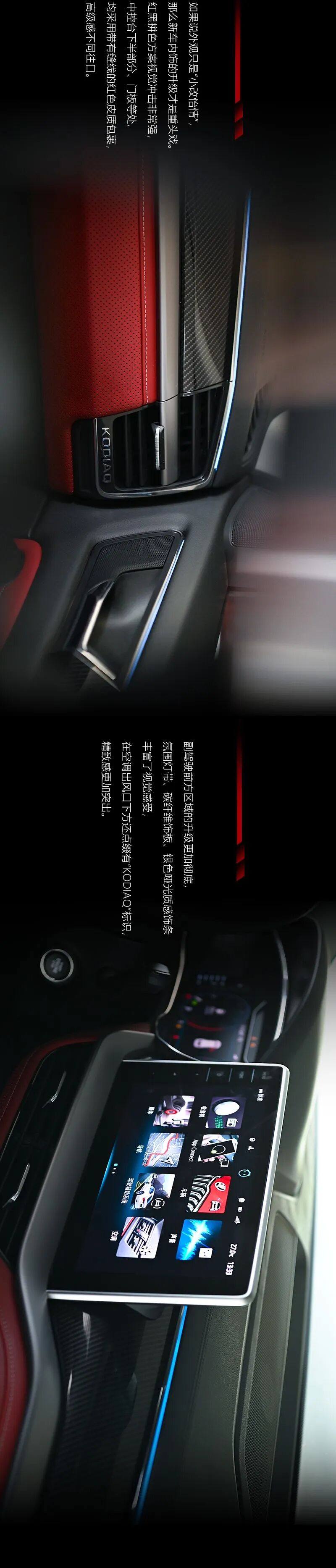 新款柯迪亚克GT和老款车型相比,外观改动较小,细节处的黑化更加突出运动属性,但新车内饰的升级诚意十足,门板、中控台均采用大量软性材质包裹(老款车型门板为硬塑料),此外12英寸悬浮式大屏以及氛围灯带的加入令车内的科技氛围和质感都有明显提升。