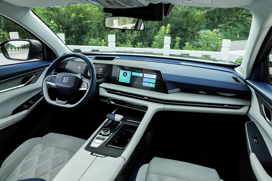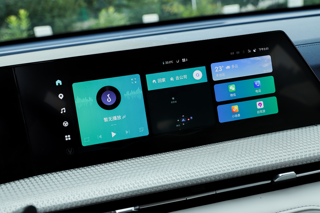 全液晶仪表盘和中控屏均为12.3英寸,屏幕显示UI较为简约,视觉效果很清爽。全液晶仪表盘提供多种显示主题可选,且支持与驾驶模式联动。中控屏支持导航、语音识别、手势控制、面部识别等功能,且内置了车载微信、爱趣听等多款应用。