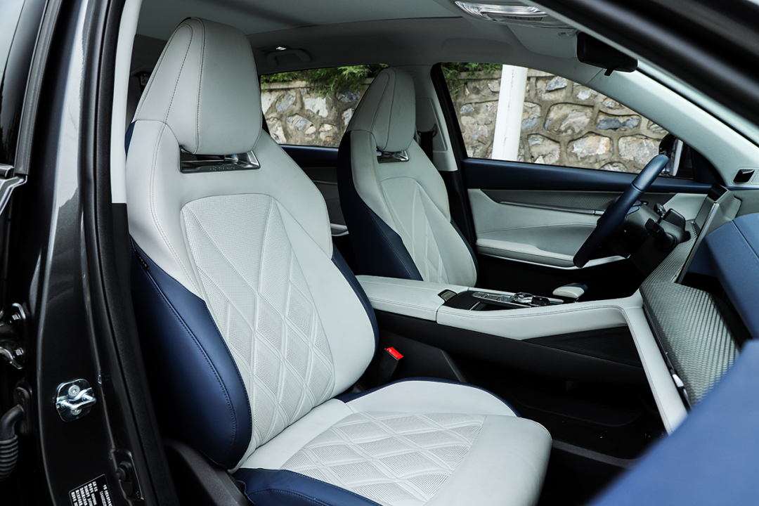 一体式的座椅看着挺运动,但内部的填充物偏柔软,更注重乘坐舒适性,第一眼很容易被欺骗。配置方面,前排座椅支持电动调节以及座椅加热功能,能够胜任日常所需。