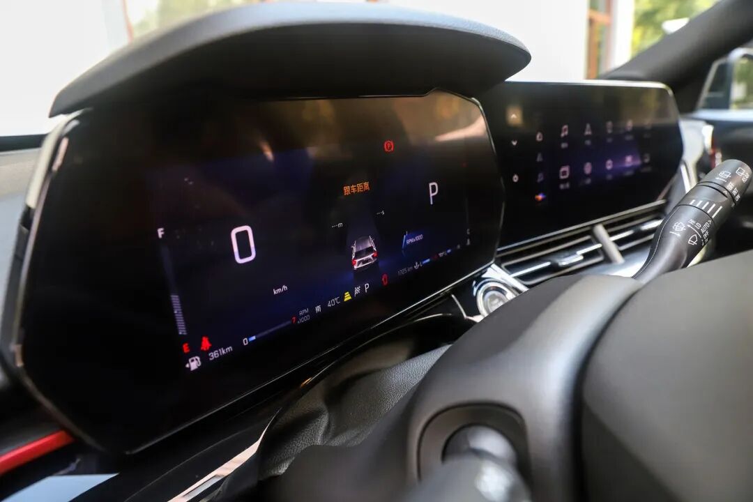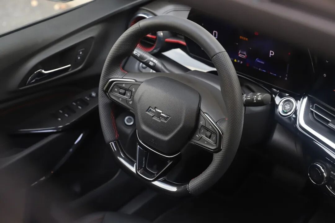 平底方向盘采用真皮材质包裹,亮黑元素、红色缝线以及打孔处理带来年轻运动气息。左侧按键主要控制自适应巡航和方向盘加热功能,右侧按键主要控制语音助手和多媒体系统。