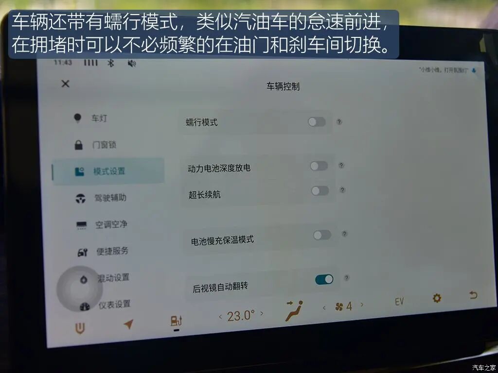 车辆的起步还算轻快,纯电模式下驱动这台接近2吨重的车子来说还是比较轻松的,配有的蠕行模式类似汽油车的怠速前进,免除了需要不停的在油门和刹车间切换,当你的油门开度较大或者车速较高时,车辆的发动机会介入工作,整个动力衔接过程非常迅速,几乎很难察觉到,总的来说,动力系统的动力输出十分线性自然,即便是突然深踩加速踏板提速,动力跟进虽迅速且直接但并不突兀,不会对行驶平顺性带来太多负面的影响,相比油门踏板的脚感,制动踏板反馈回来的脚感生硬且偏重,即便是“制动踏板感调节”处于舒适模式下也是如此,同时制动力在初段就比较足,需要适应一段时间。