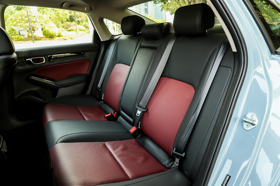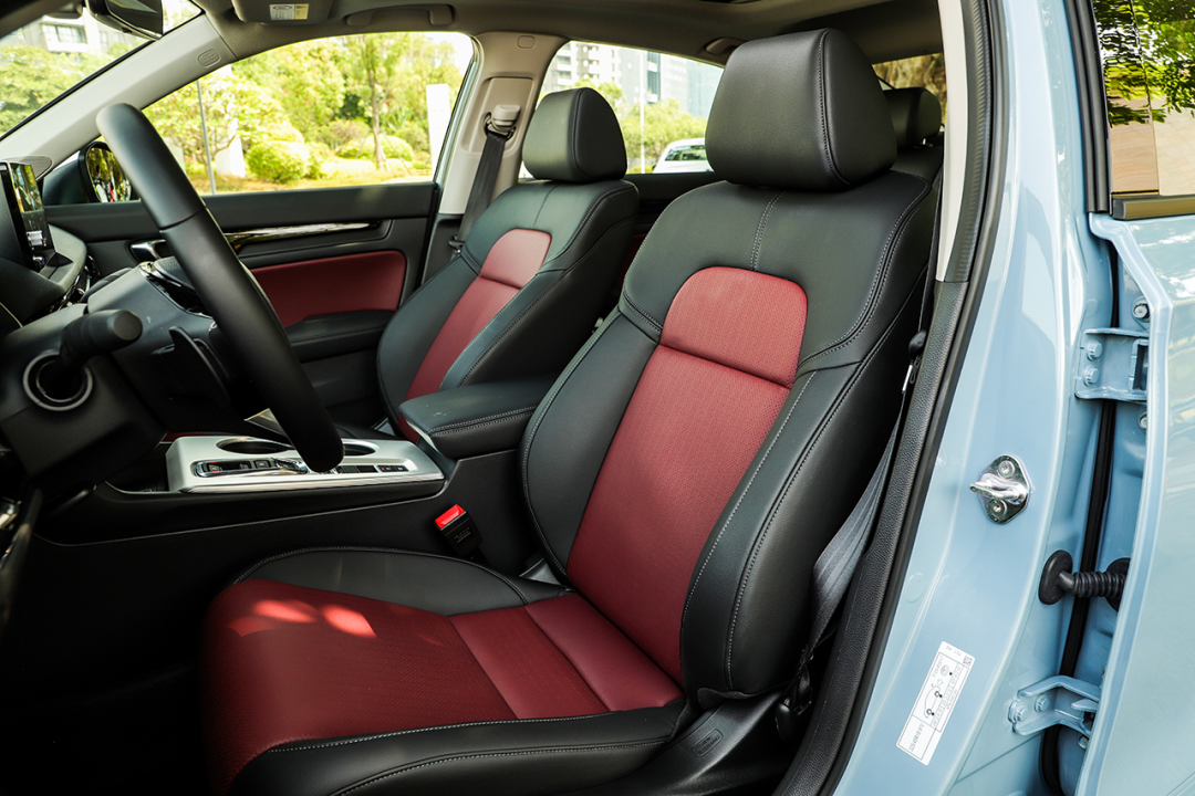 座椅采用黑/红双拼的皮质面料包裹,带来了不错的运动感,座椅内部填充物软硬适中,乘坐舒适性和包裹性都挑不出大毛病。配置方面,前排座椅均支持电动调节,且配备了燃油版车型上所没有的前排座椅加热功能,舒适性配置表现更好。