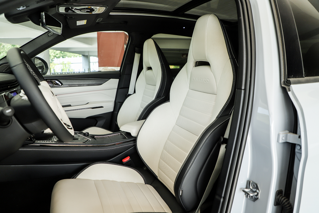 一体式运动风格座椅是领克车型一贯的标配,座椅造型不会让人感到陌生。前排座椅采用NAPPA真皮/翻毛皮混搭材质包裹,触感舒适、细腻。配置方面,前排座椅多向电动调节、前排座椅加热、主驾驶座椅通风/记忆等功能均有配备。