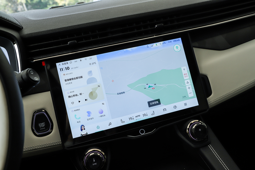 12.3英寸全液晶仪表盘的界面UI经过重新设计,加入了剩余电量、纯电续航里程等车辆信息以及动力输出的能量流标识,便于驾驶者了解行驶时的动力输出工况。12.8英寸中控屏搭载全新的车机系统,界面UI采用与领克09相同的设计,而在硬件配置上,8155车规级芯片以及12G的超大运行内存绝对够“下本”了。功能方面,在线导航、语音识别、应用商城等常用的功能都有,没什么可挑剔的。