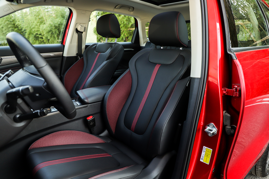 座椅采用皮质包裹,黑/红双拼的面料配色有效地提升了档次感。配置方面,配备了主驾驶座8向电动调节以及前排座椅加热功能。