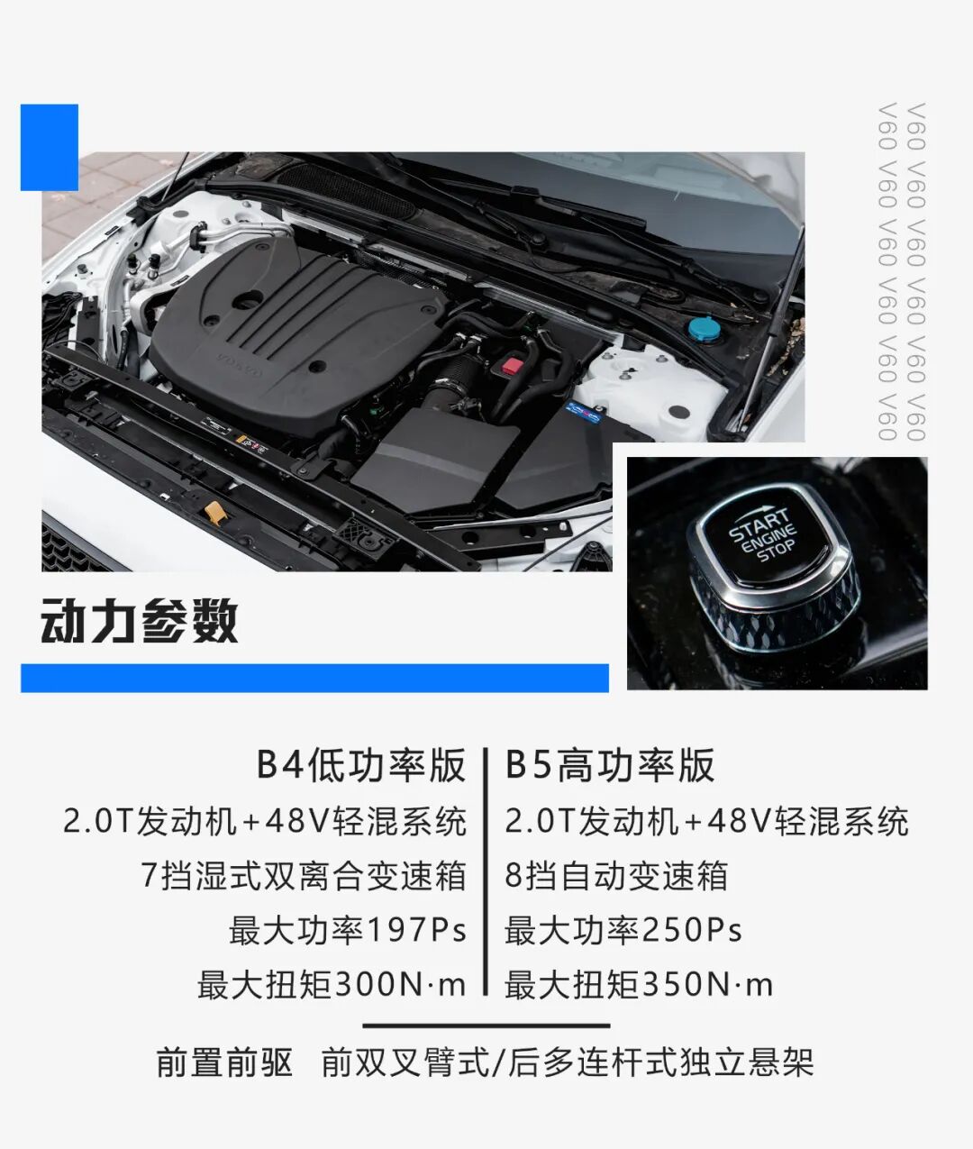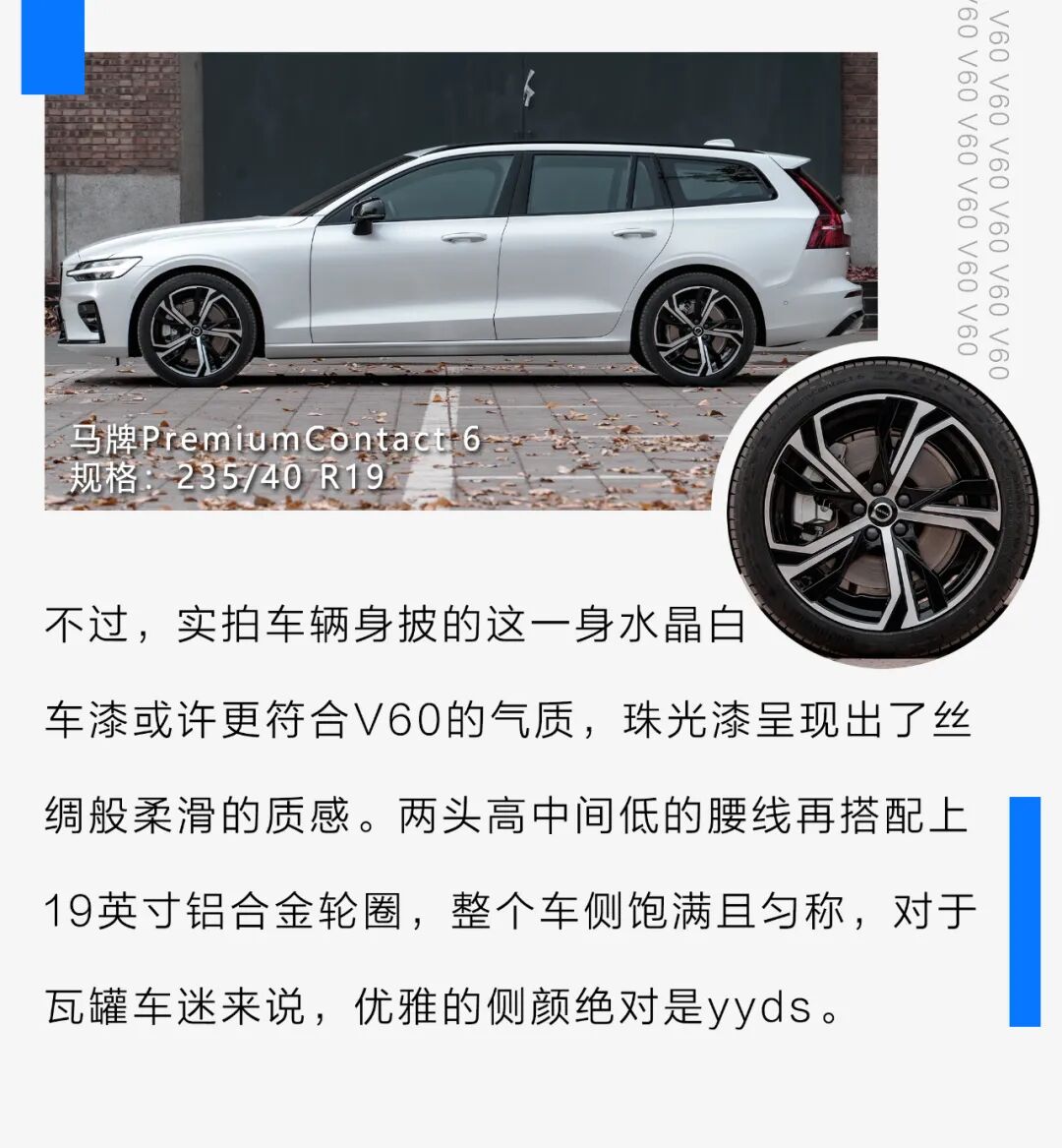 特别是,相比那些同样为横置前驱布局的竞争对手,沃尔沃V60加长了前轮到防火墙之间的距离,令其有着更像是纵置发动机布局车型的侧面比例,这也带来了更加修长匀称的车身线条。