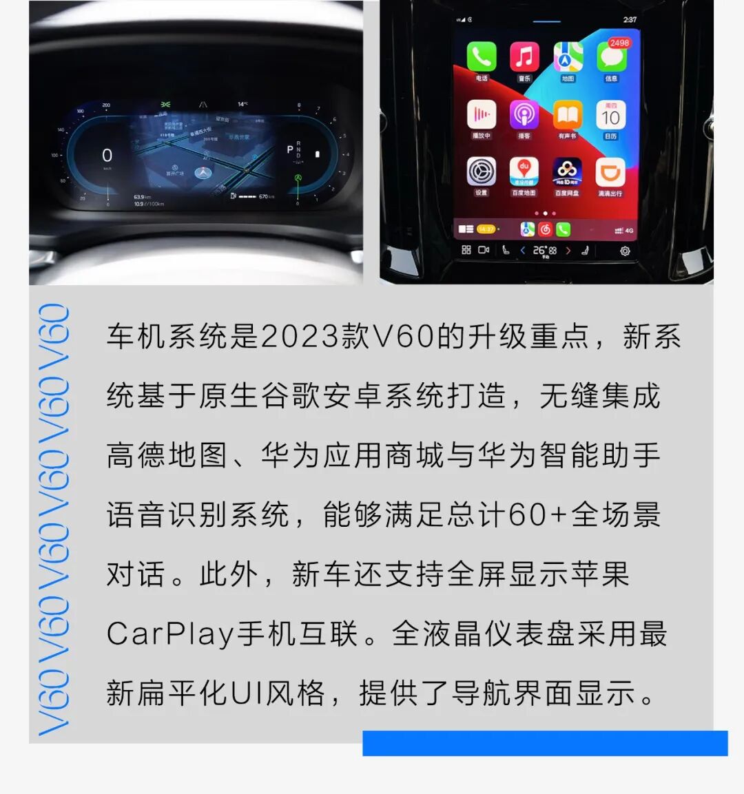 不过,今天这台2023款沃尔沃V60的升级的确令我们看到了些惊喜,提供了更丰富的车漆颜色选择,特别是升级了最新的车机系统,CarPlay功能从此前的半屏投影,调整为了全屏显示,这极大丰富了车机系统的美观度与扩展能力,体验上提升很大。